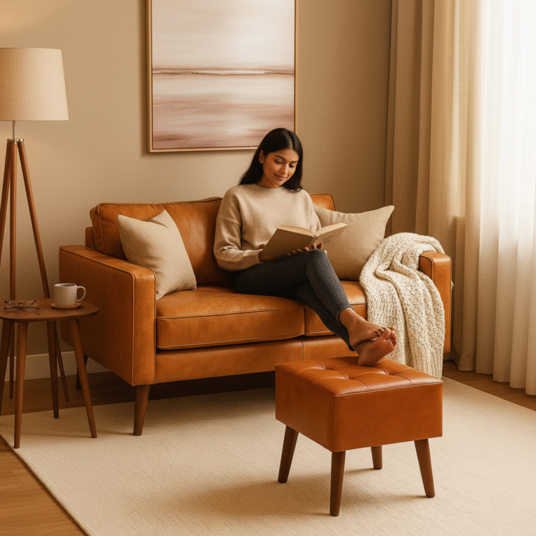 This contemporary round pouf features a smooth, dome-shaped top that offers a minimalist and refined aesthetic. Upholstered in a rich leatherette, the pouf has a clean silhouette that pairs well with various interior styles—from rustic to modern. The gently angled solid wood legs provide stability and a warm contrast, making it ideal for use as a footrest, extra seating, or an accent piece in living spaces or bedrooms.