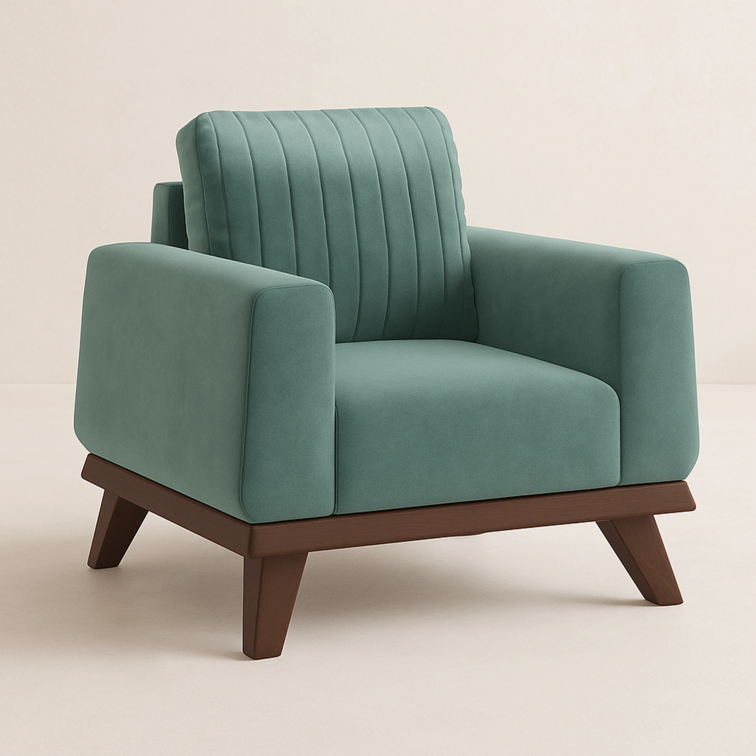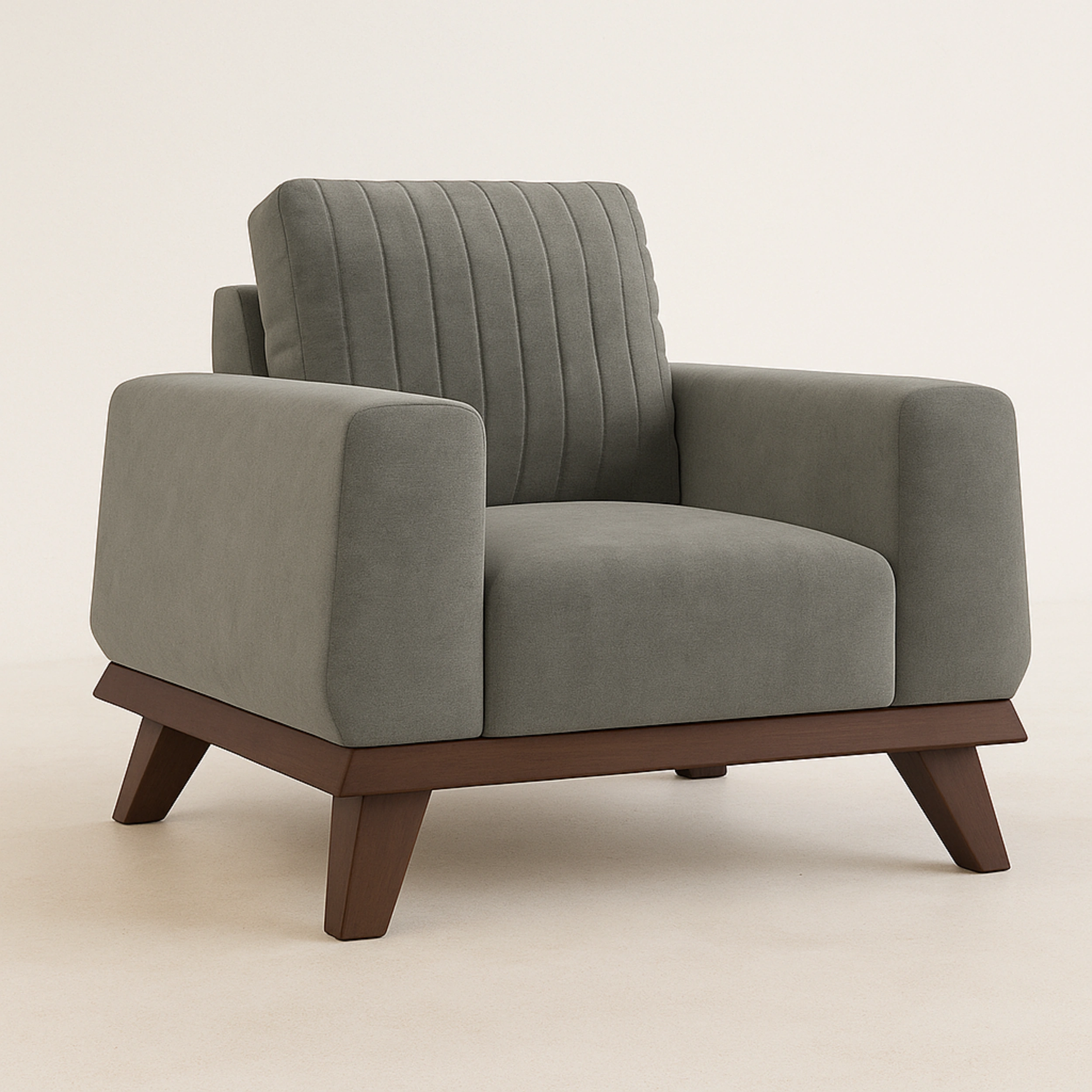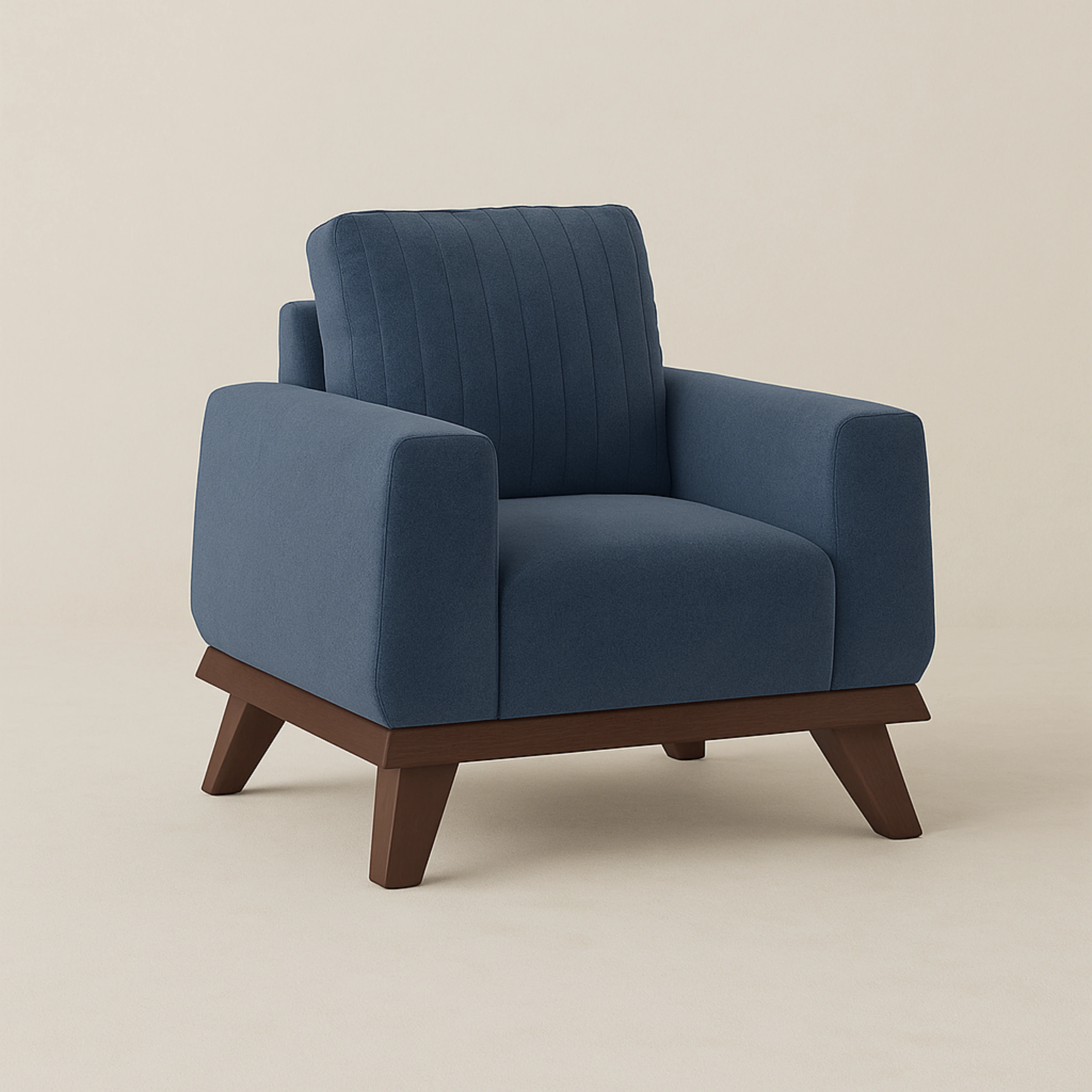This contemporary armchair showcases a bold, structured silhouette with clean lines and a balanced mix of mid-century and modern aesthetics. Designed for comfort and style, it features generously padded cushions, wide arms, and a low-seated profile that lends a grounded, inviting feel to any space.