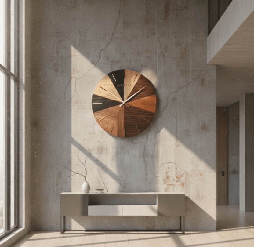 The Aven Wall Clock is a bold interplay of craftsmanship and contemporary design. Featuring a striking segmented wooden dial made from contrasting wood tones, Aven transforms timekeeping into a visual statement. Each section highlights a distinct grain and shade, creating depth, rhythm, and balance. Finished with sleek metal markers and hands, this clock is designed for modern interiors that appreciate detail, texture, and individuality.