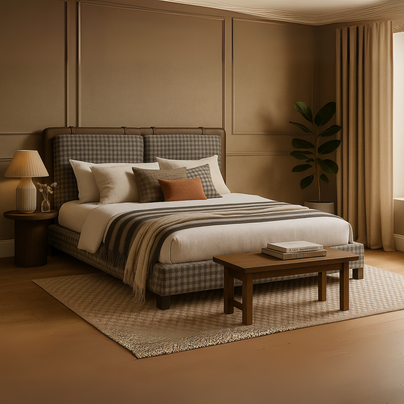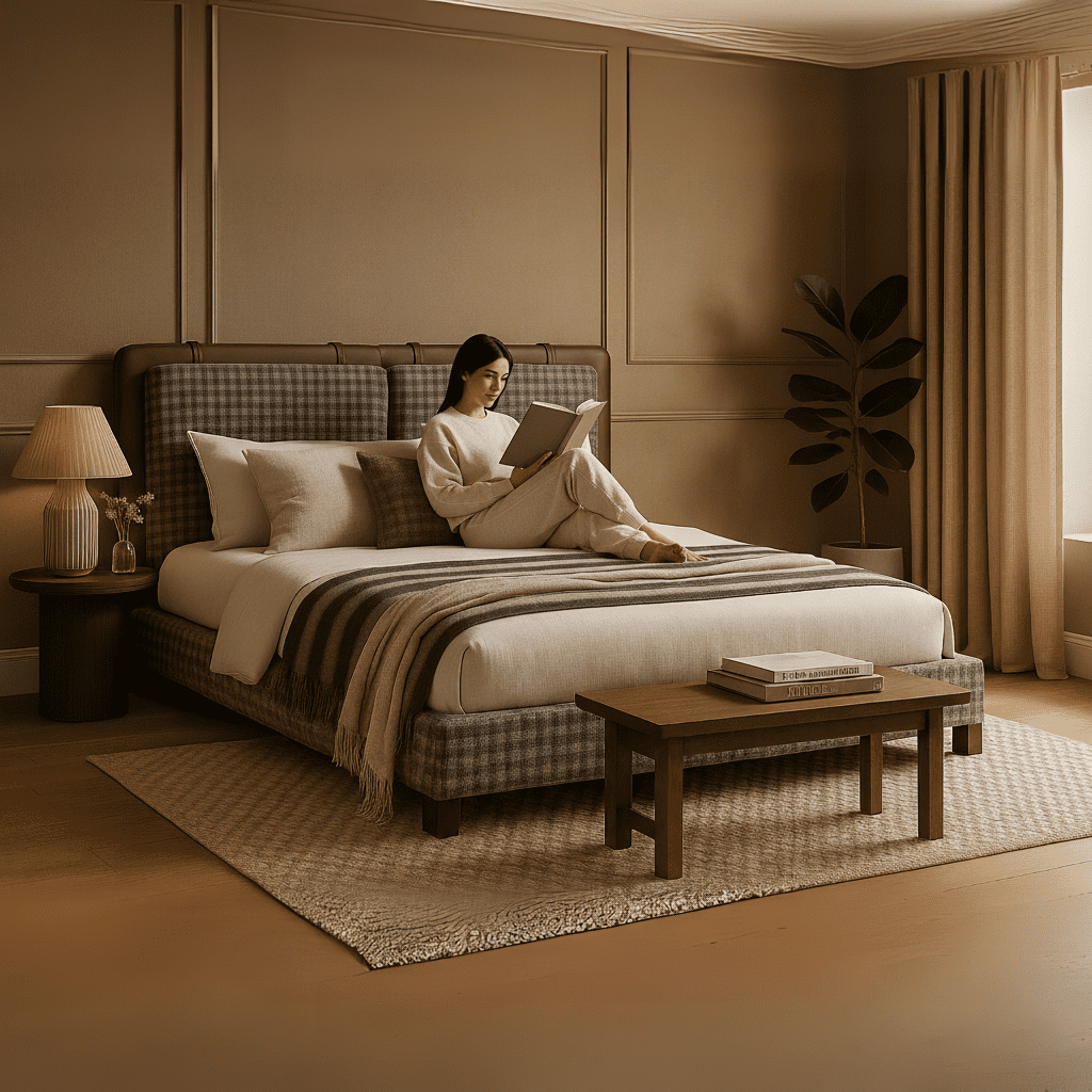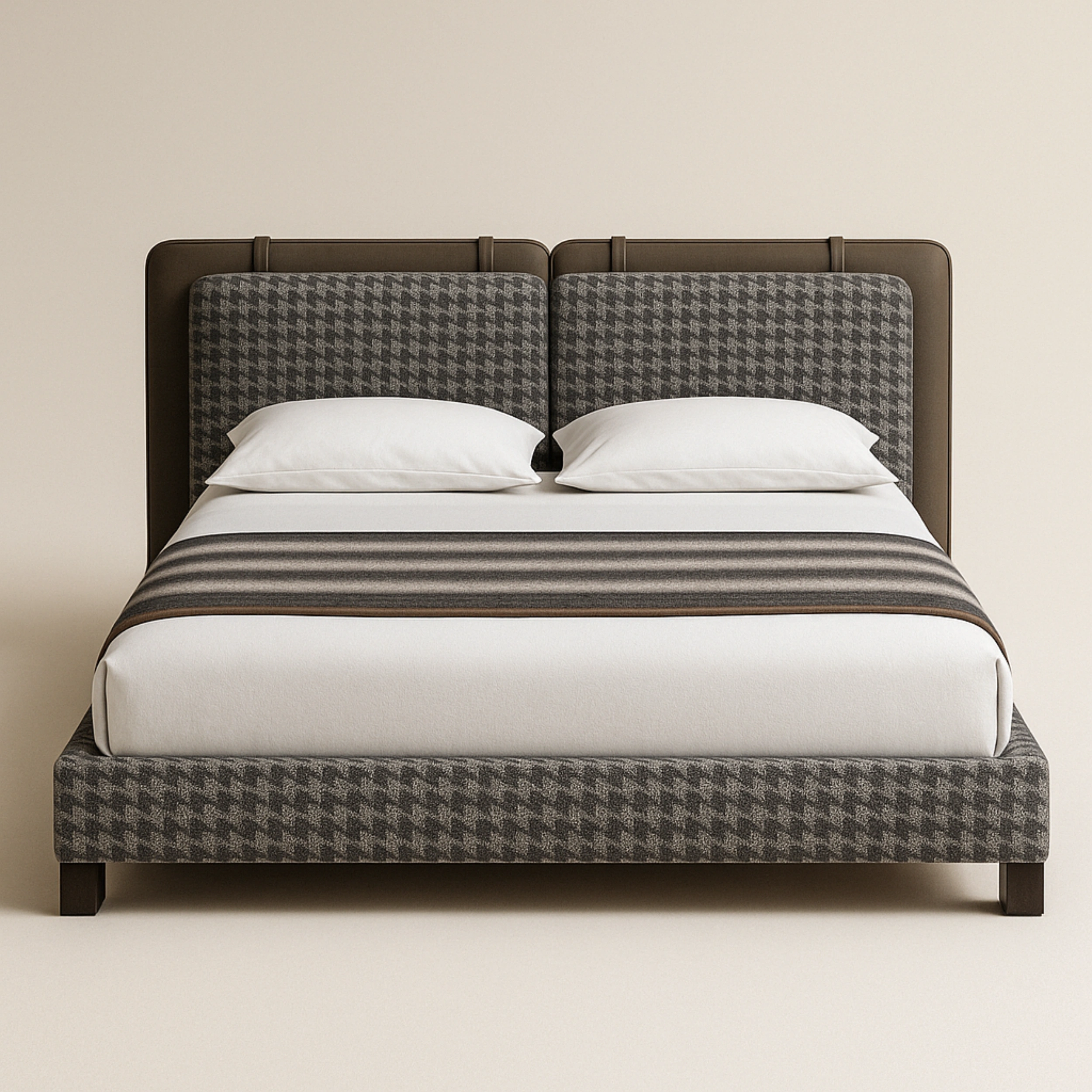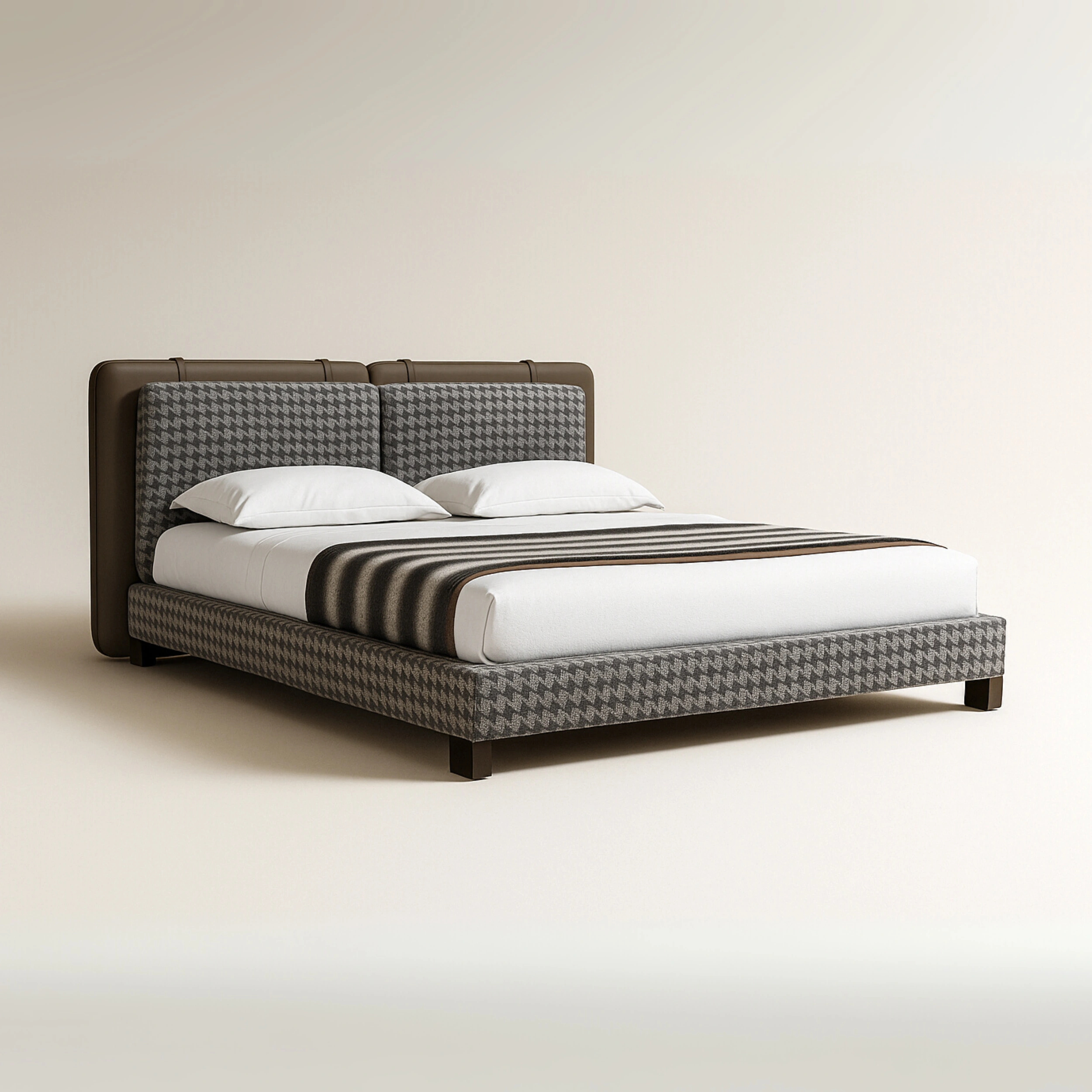 A luxurious modern bed featuring a fully upholstered base and headboard in bold houndstooth or geometric-patterned fabric. The headboard is plush and panelled, offering excellent back support and design appeal. Side and front edges are upholstered for a cohesive, soft-edged look. Perfect for high-end contemporary bedrooms, hospitality, or custom interiors.