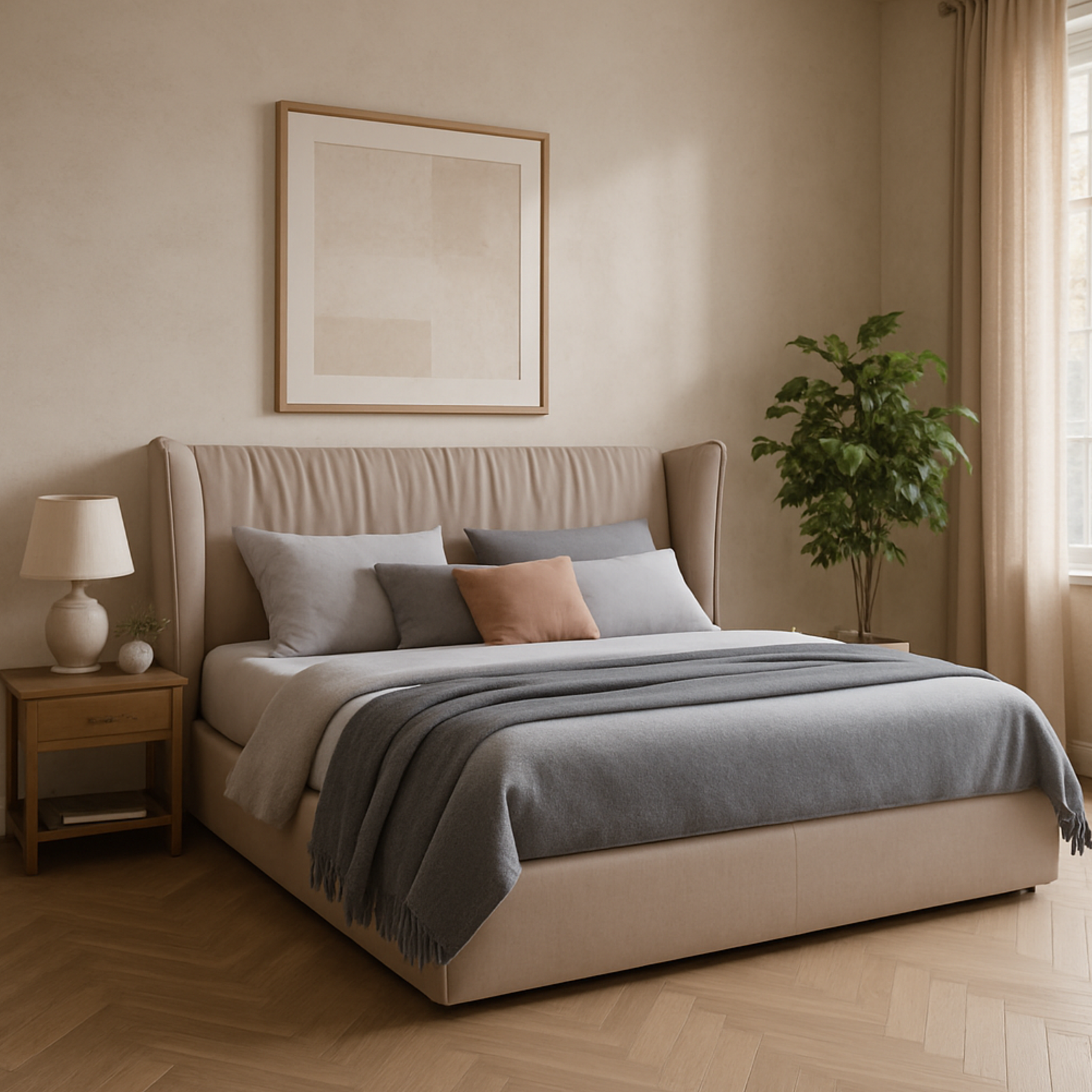 Fabric: Premium suede or velvet fabric in light taupe.