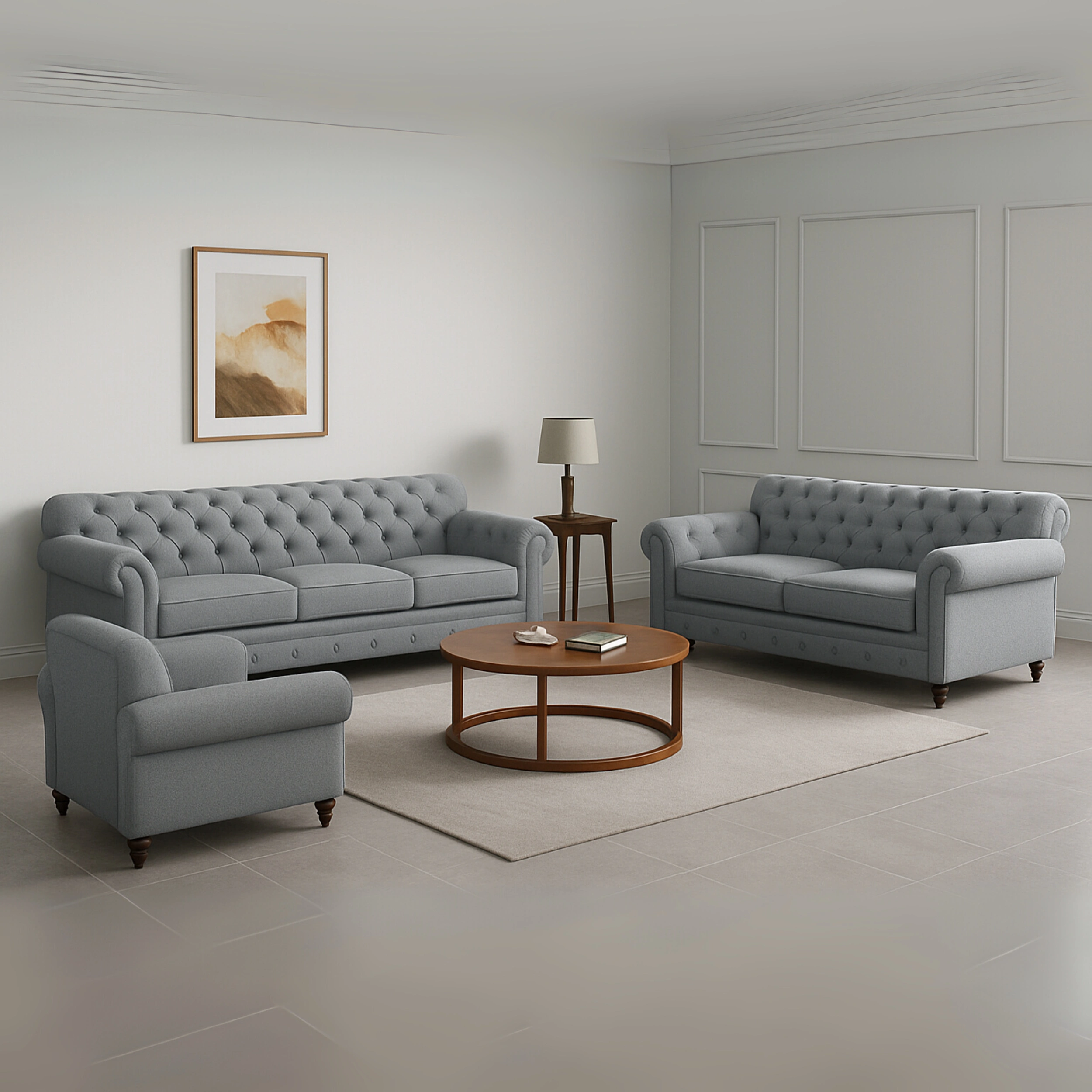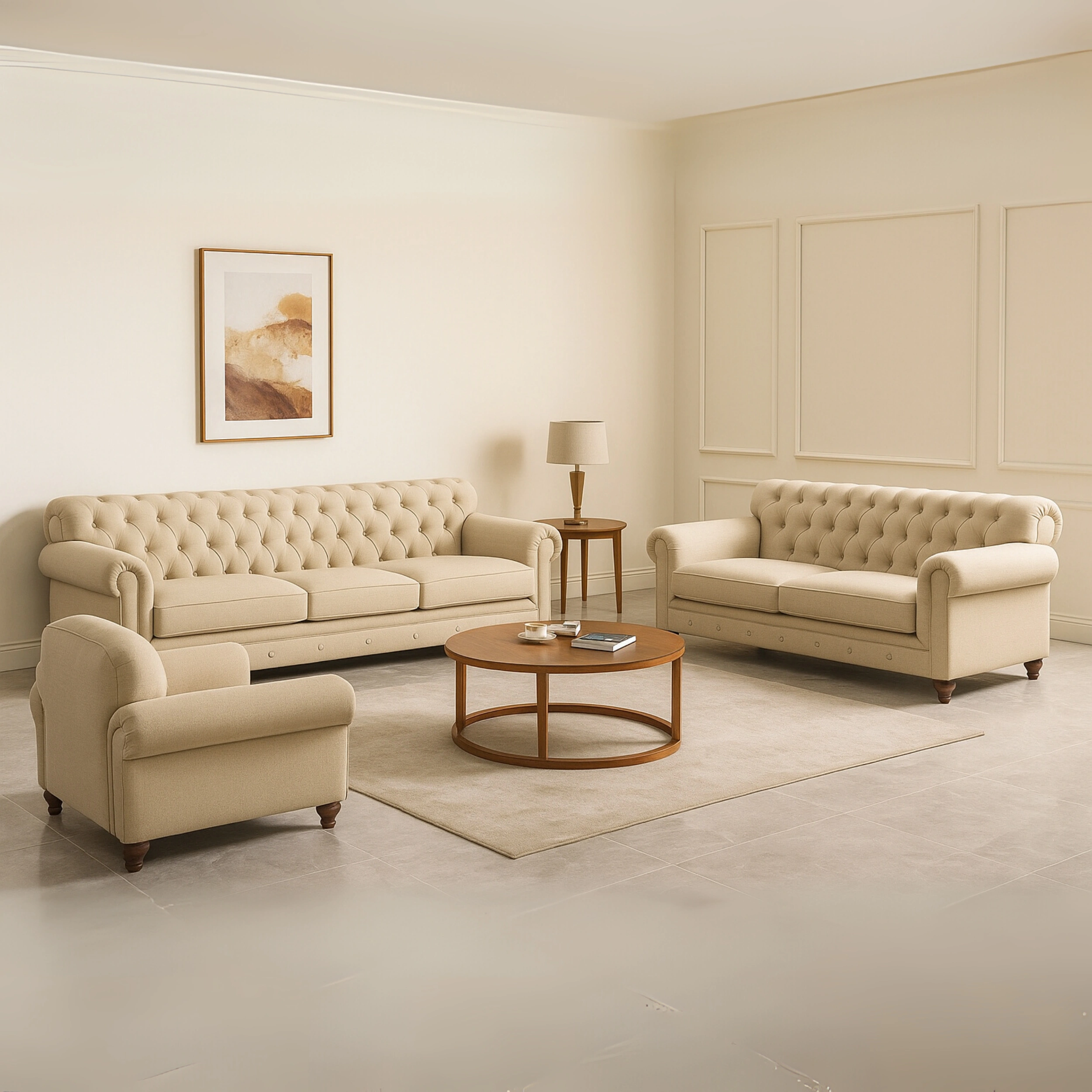 This plush sofa set delivers casual sophistication and timeless comfort with its rounded arms, deep seat cushions, and soft upholstery. Designed for modern living spaces, the set combines aesthetics and functionality, making it ideal for lounging, entertaining, or family evenings.