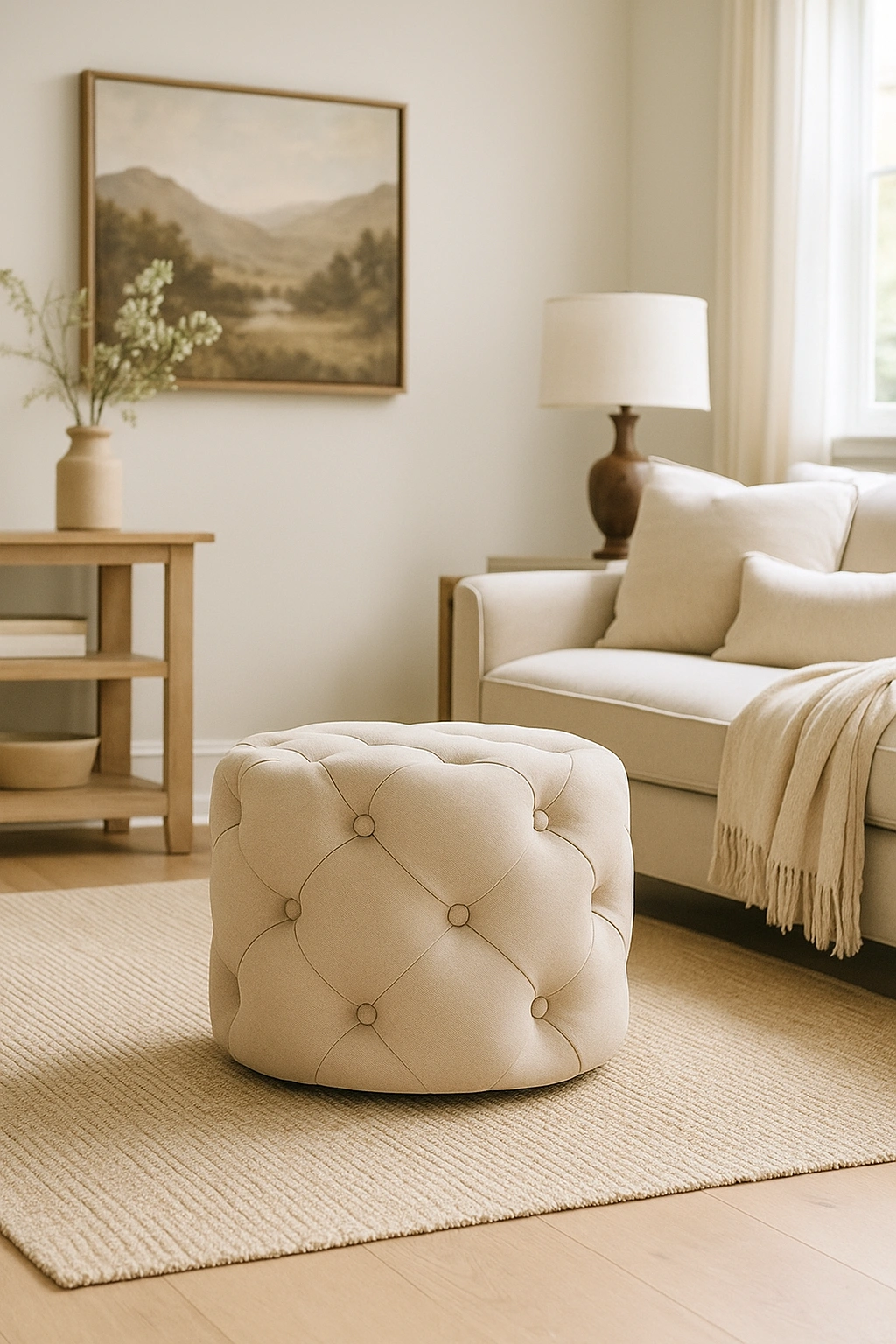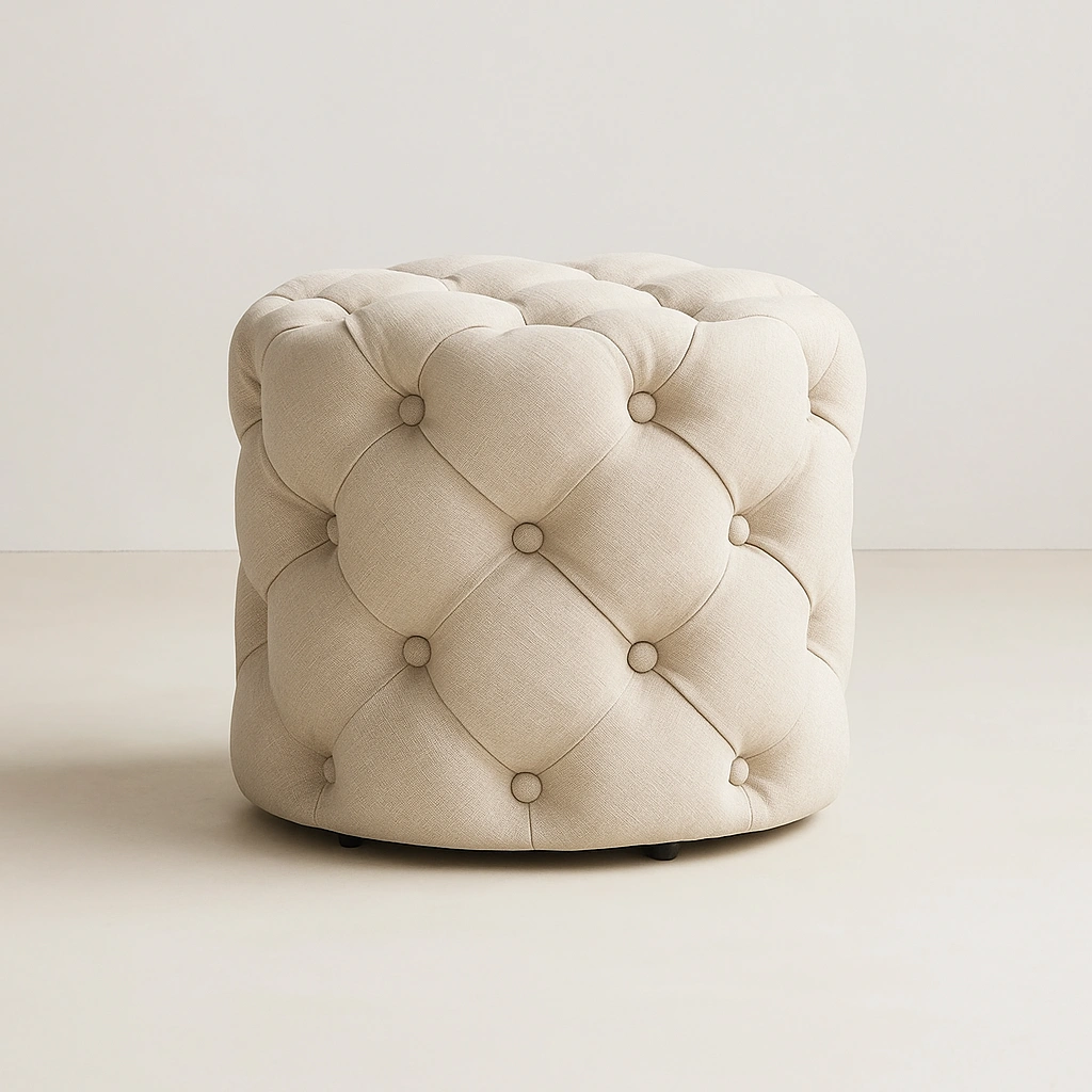 This luxurious pouf is designed with deep, diamond-patterned tufting that gives it a classic Chesterfield-inspired look. Upholstered in rich royal velvet, it exudes elegance and plush comfort, making it a perfect accent piece for high-end interiors. Its soft, pillow surface makes it suitable as a footrest, additional seat, or a decorative centerpiece in living rooms, bedrooms, or lounge areas.
