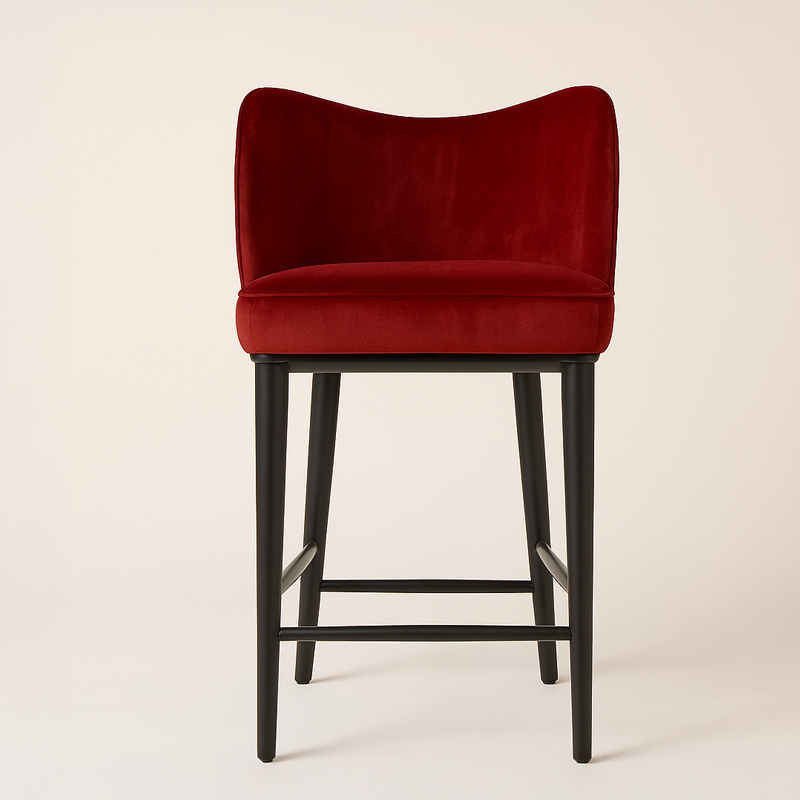 The exclusive Crest toffee red velvet bar stool offers a luxurious look and feel. Designed in-house, its exaggerated curves and black wooden legs create a subtle statement. Crafted with a recycled toffee red velvet, the crest provides a classic, elegant look, bringing warmth and a pop of colour to any dining space. The padded seat and curved backrest offer exceptional comfort thanks to its foam and fibre filling. These stylish bar stools work perfectly placed at a kitchen island or breakfast bar and can be styled individually or as a set. Complement them with one of our contemporary dining benches or a sleek dining set.