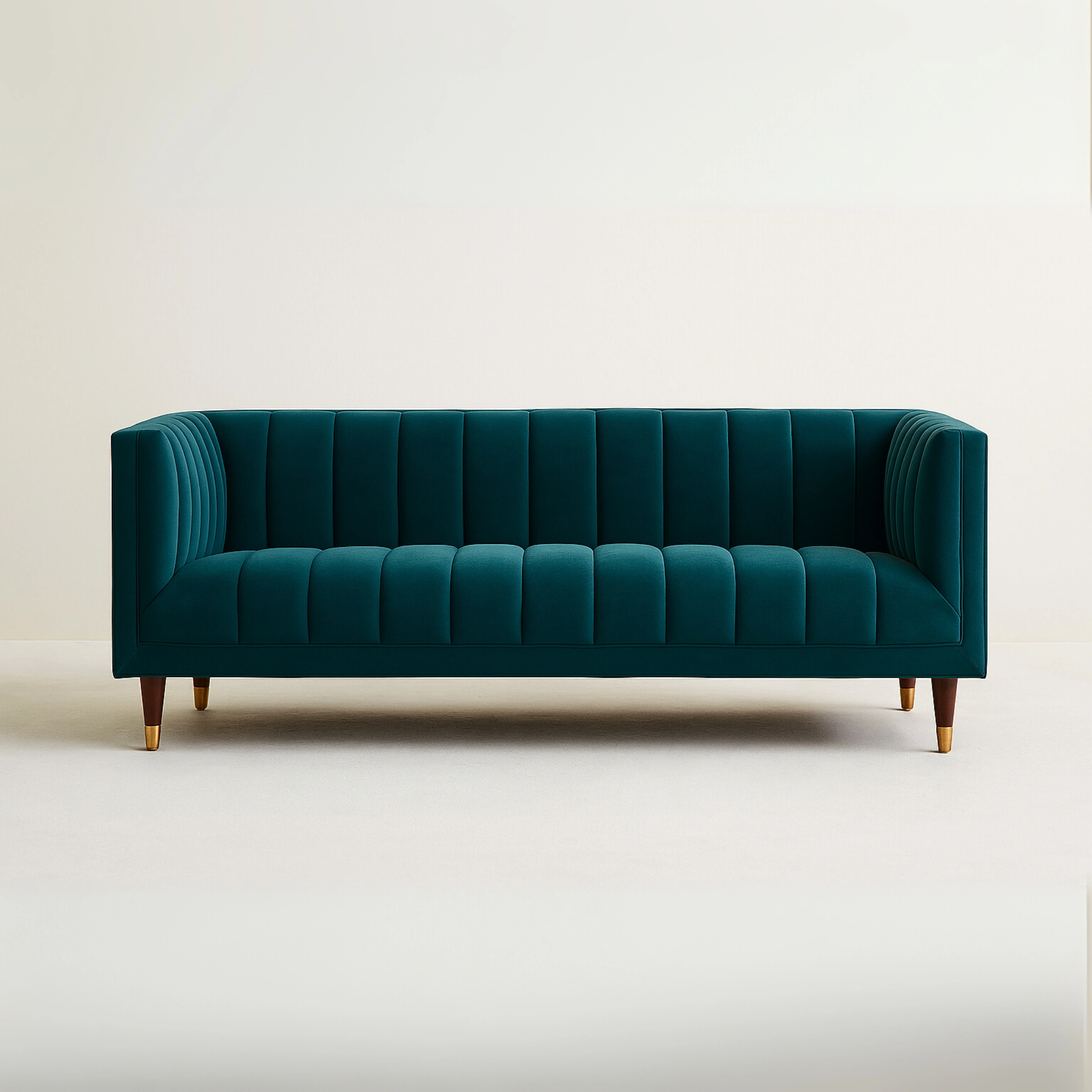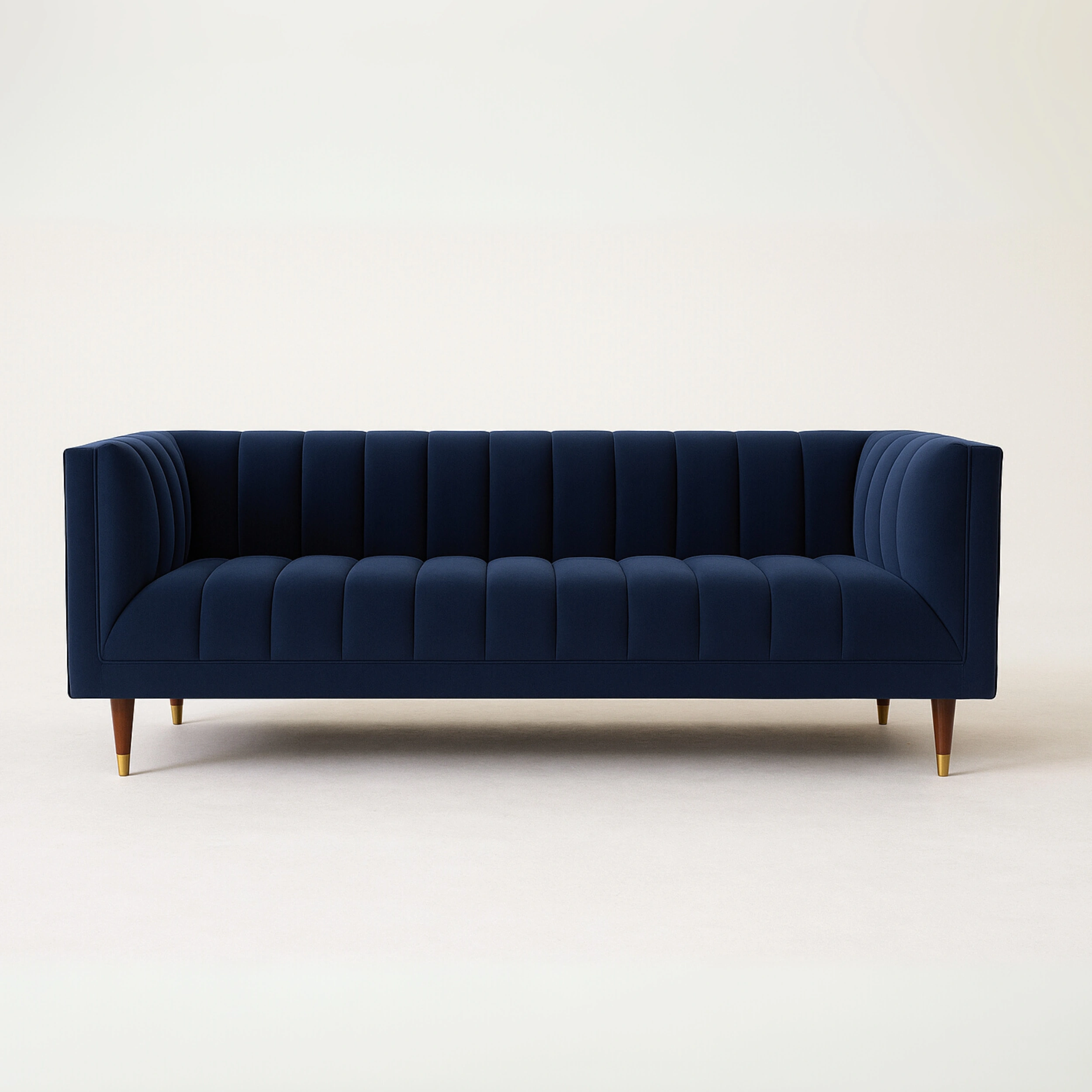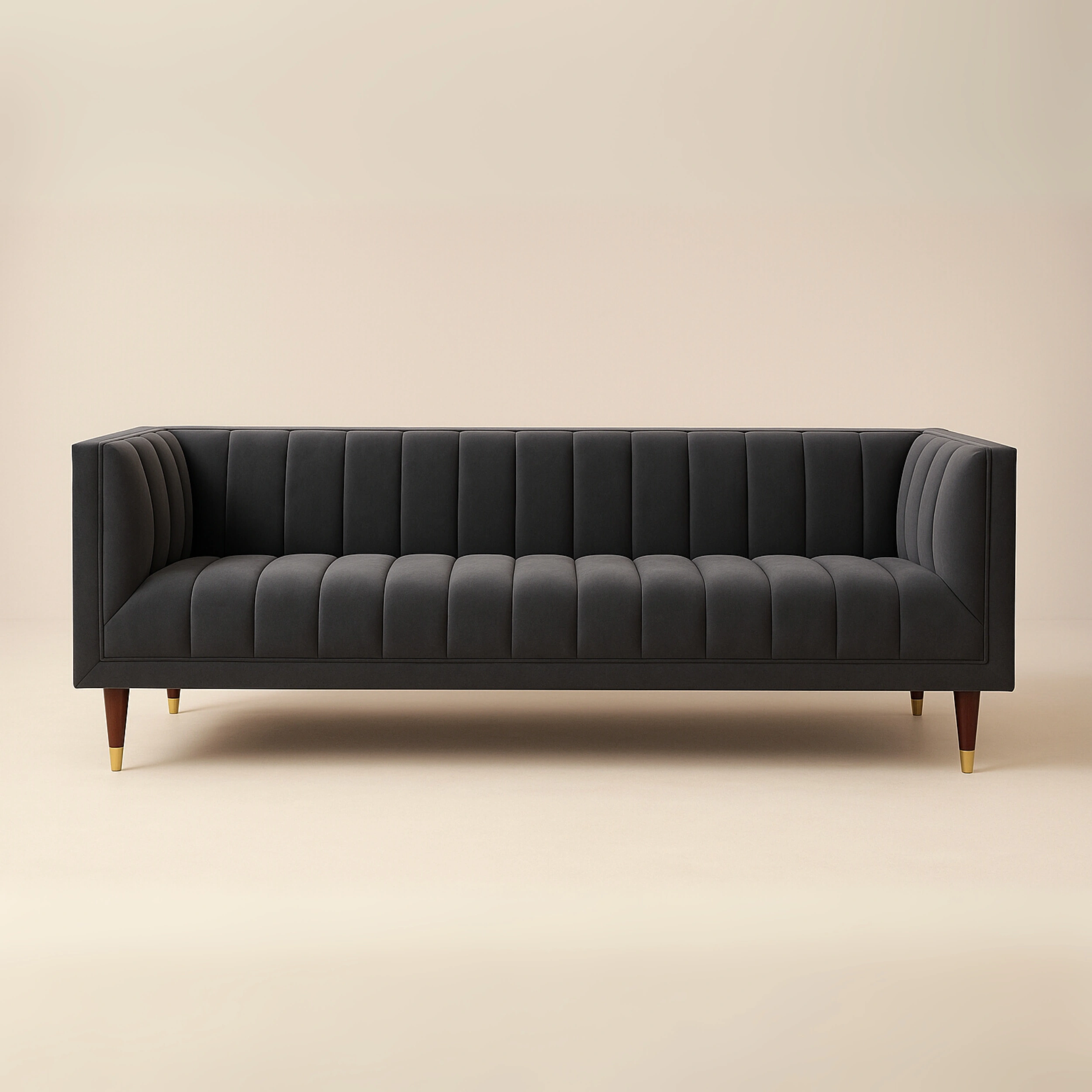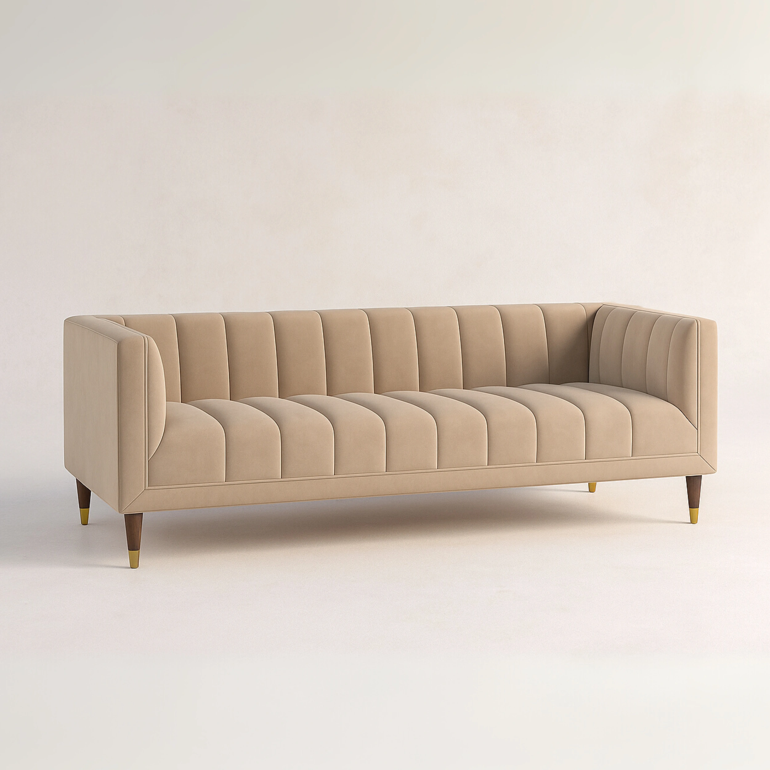 This sleek 3-seater sofa showcases a contemporary silhouette with refined vertical channeled tufting on the backrest and seat. Its plush, low-profile design and full upholstery in soft beige velvet add elegance and warmth, ideal for modern and minimalist interiors. Tapered wooden legs with gold metal tips provide a stylish accent and stable support.