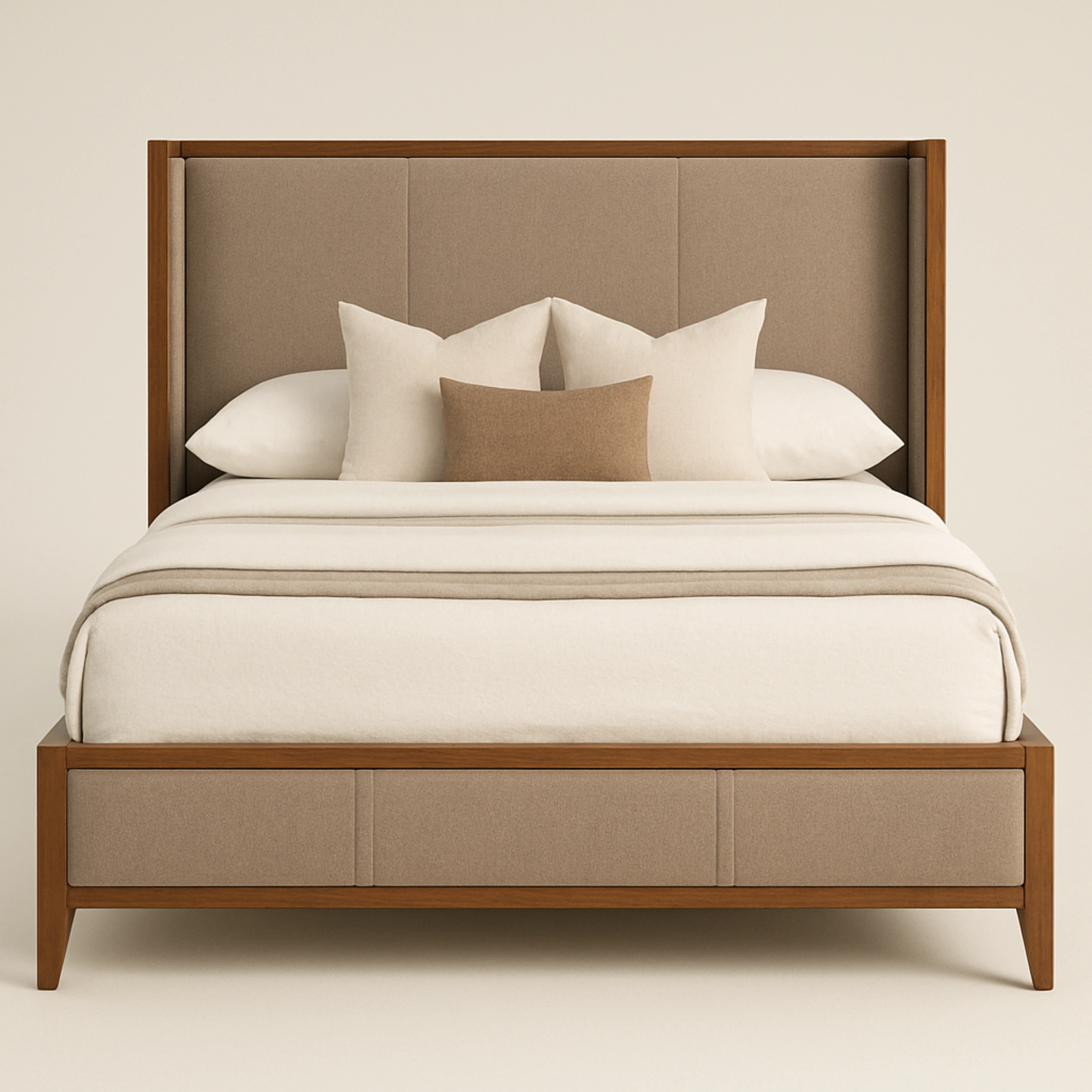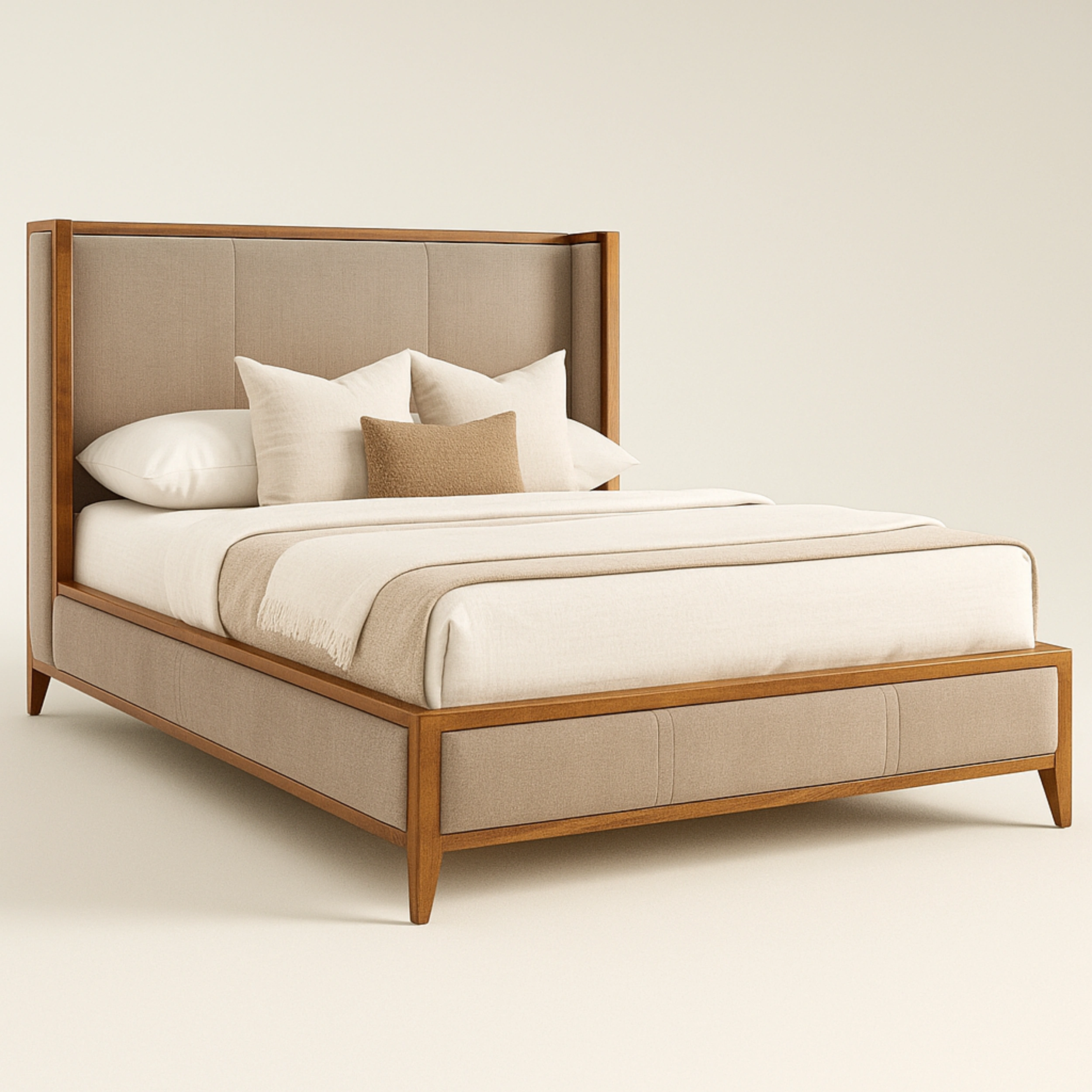 This sophisticated bed blends modern elegance with traditional warmth through its exposed wooden frame and soft upholstered panels. The high-back winged headboard and padded foot and side panels give this piece an inviting feel, making it an excellent centerpiece for transitional or modern classic bedrooms. The wooden outline provides architectural interest while the fabric infill ensures comfort and style.
