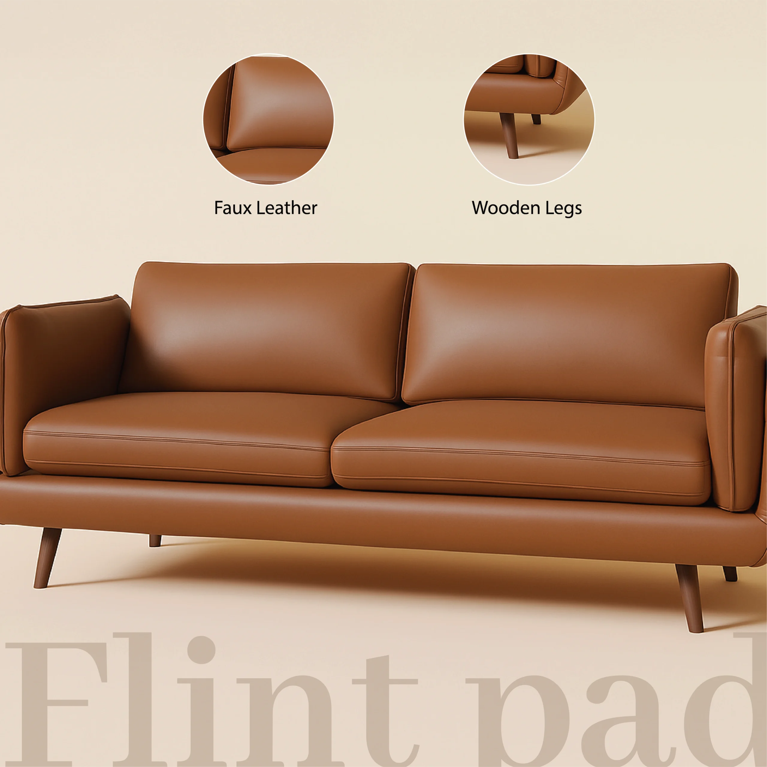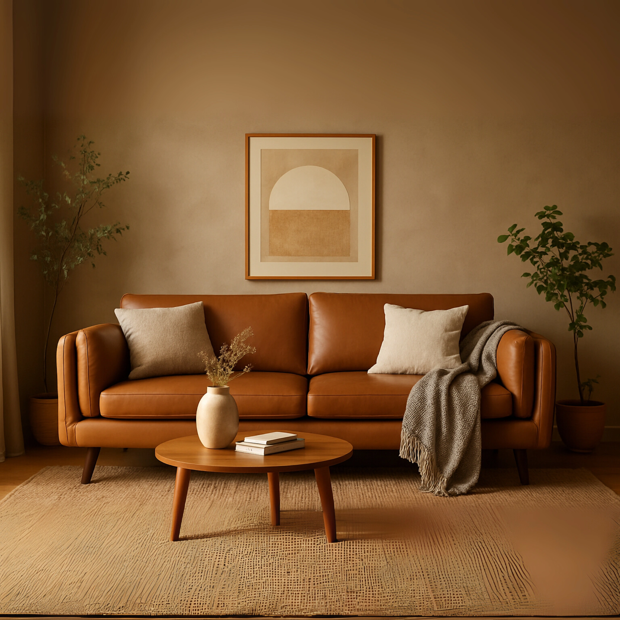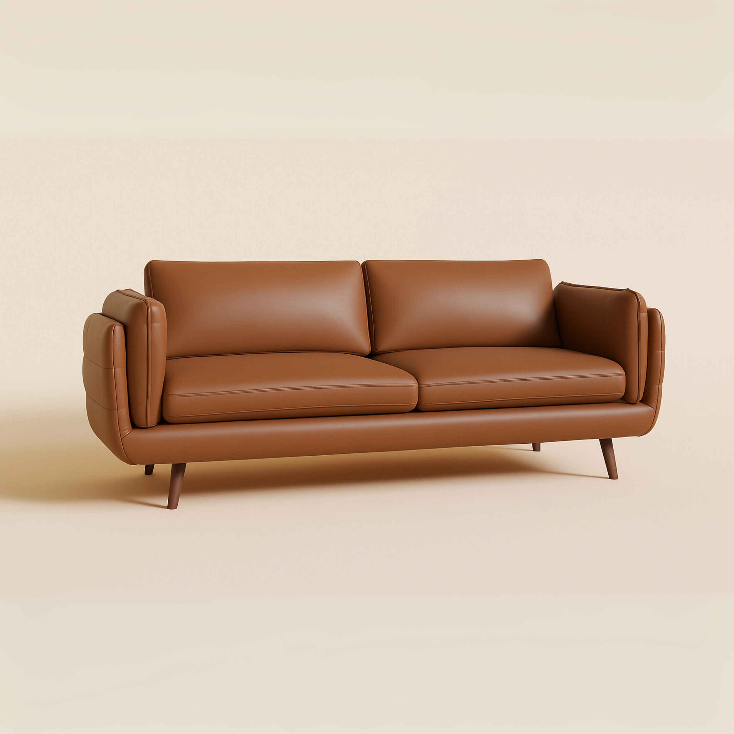 This elegant 3-seater sofa features sleek lines, a structured silhouette, and a refined tan leather finish that exudes understated luxury. Its mid-century inspired wooden legs and tailored cushions make it a standout piece in modern, minimalist, or earthy interior spaces.