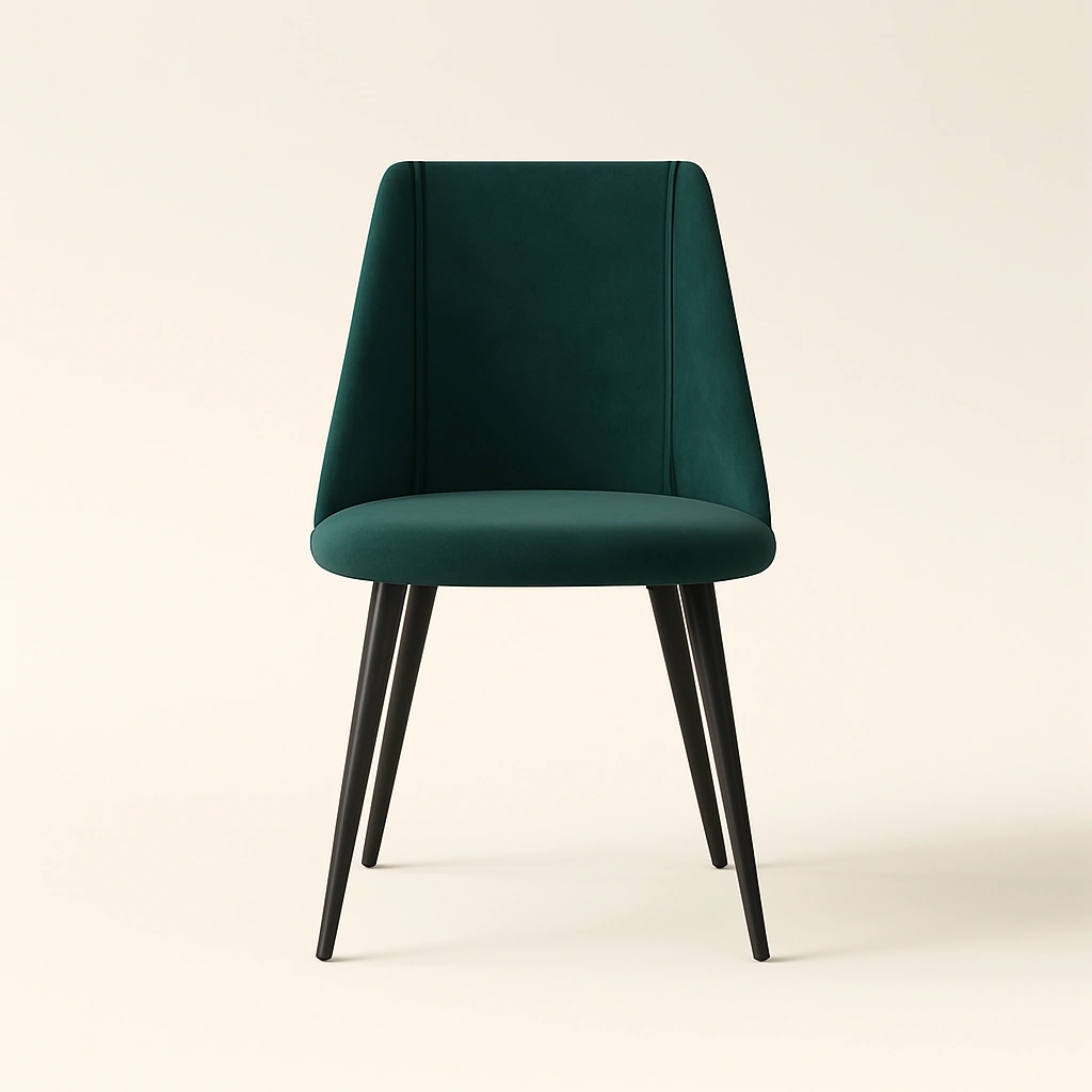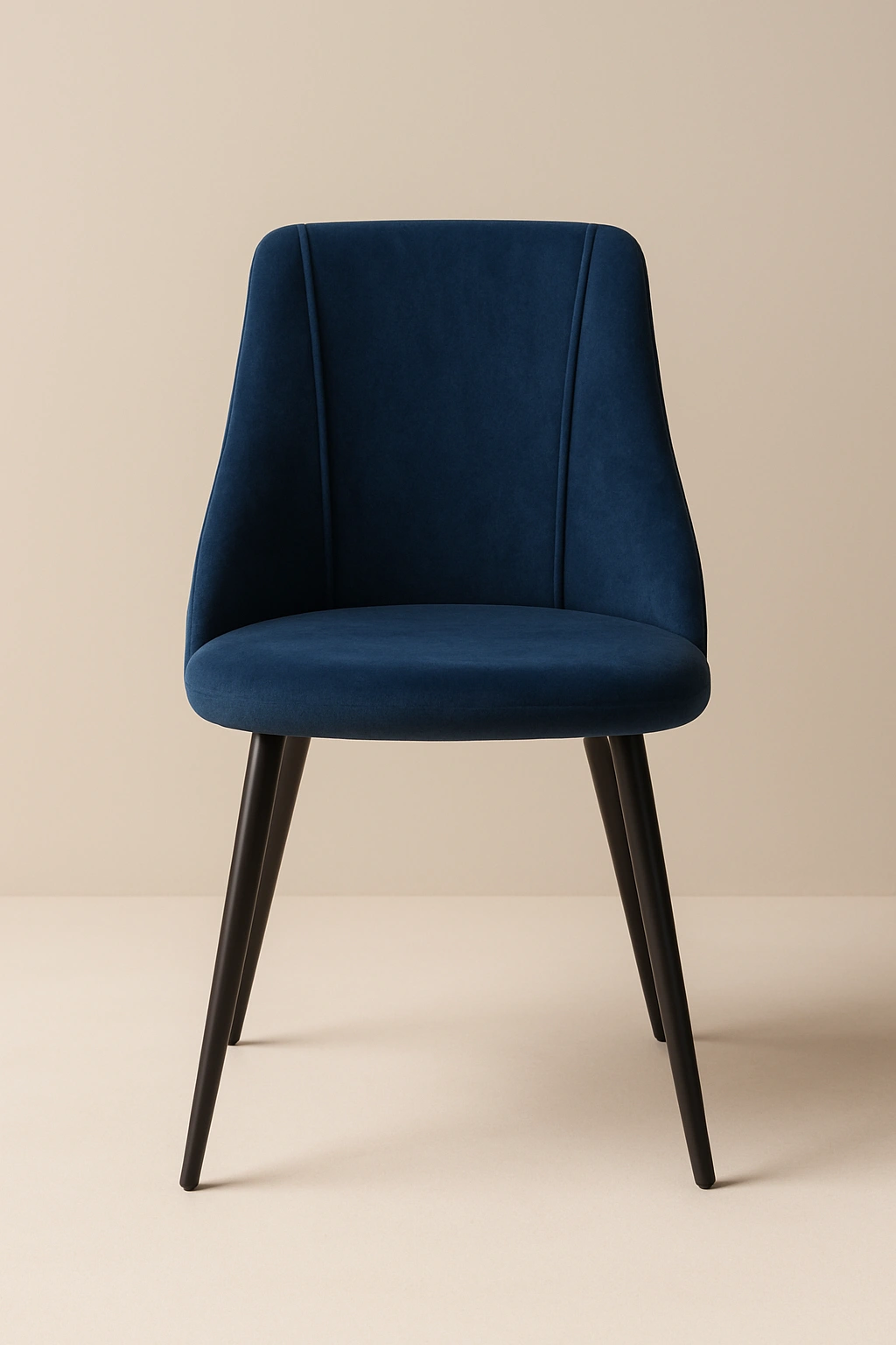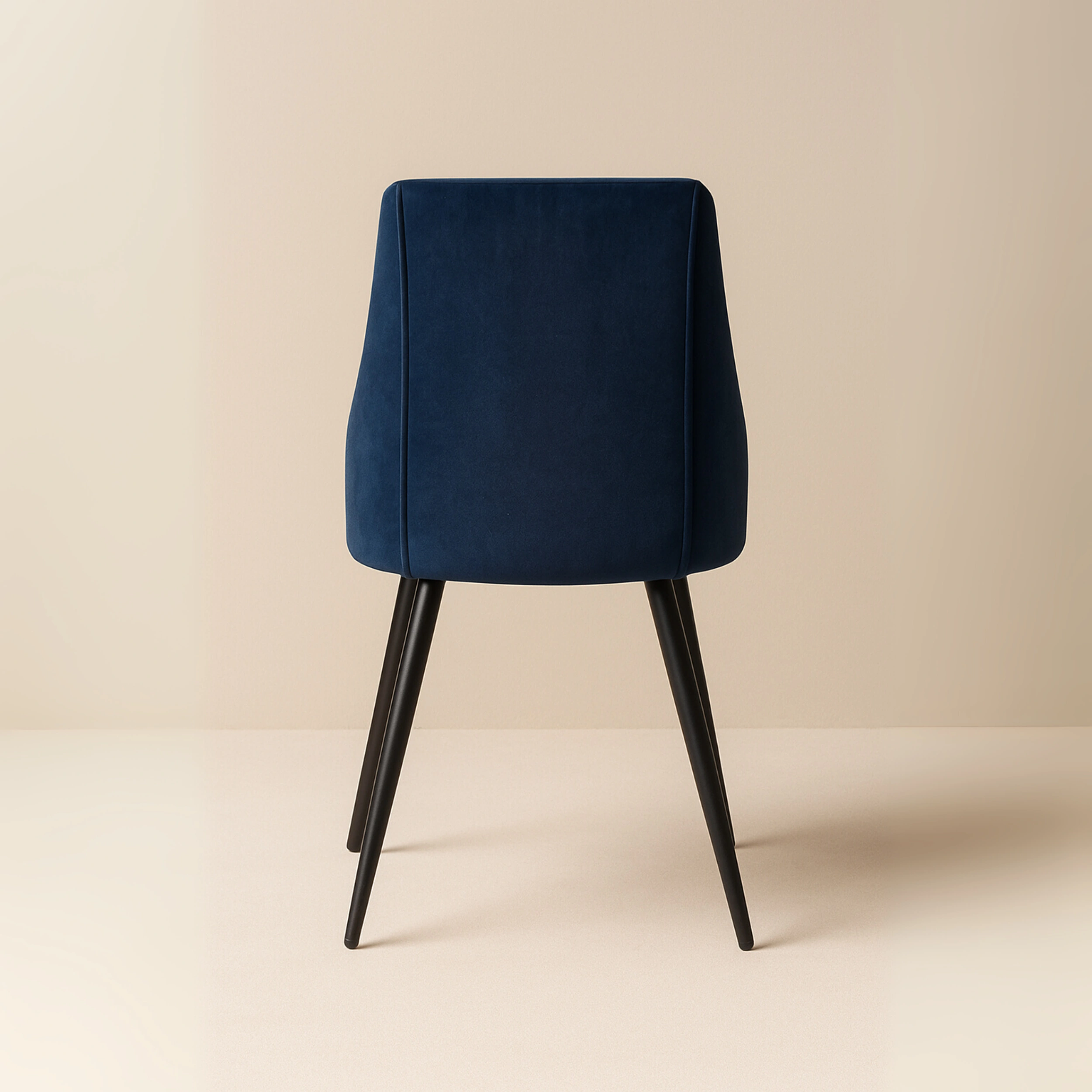 Elegant modern dining chair upholstered in navy blue velvet with minimal seam accents and matte black tapered metal legs. Ideal for dining, study, or office use.