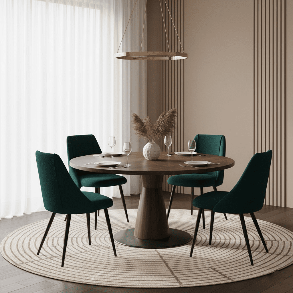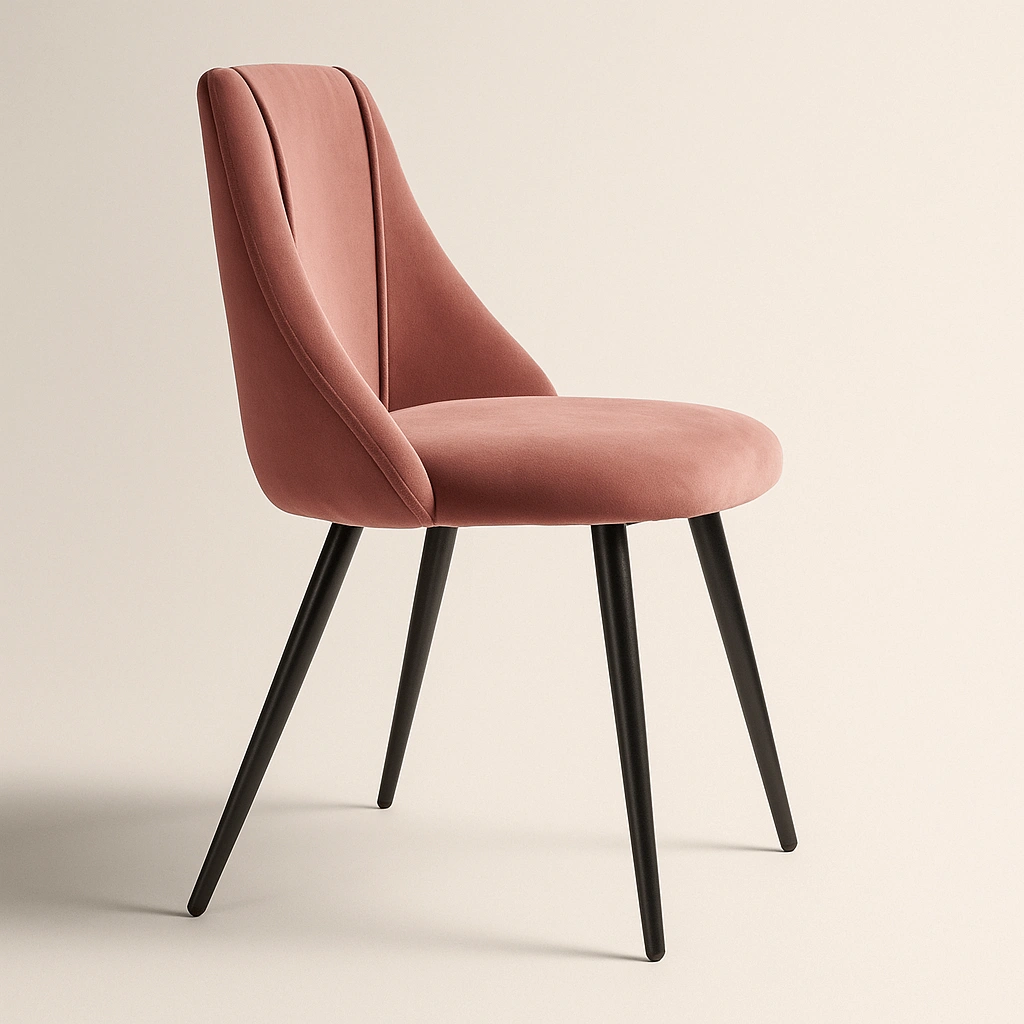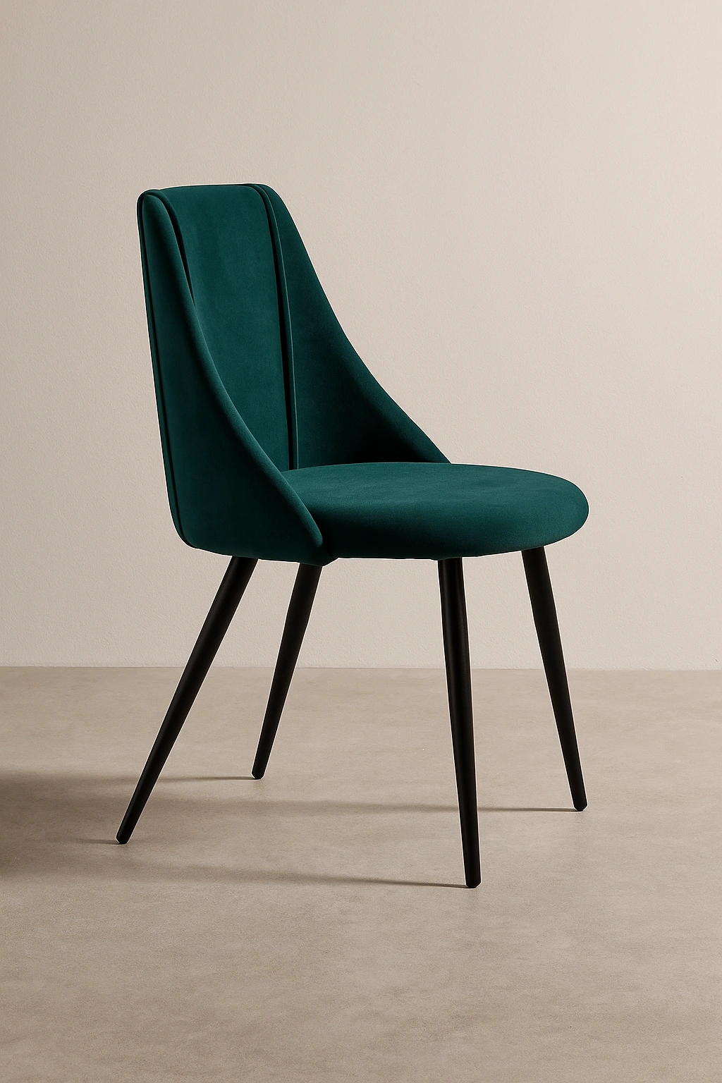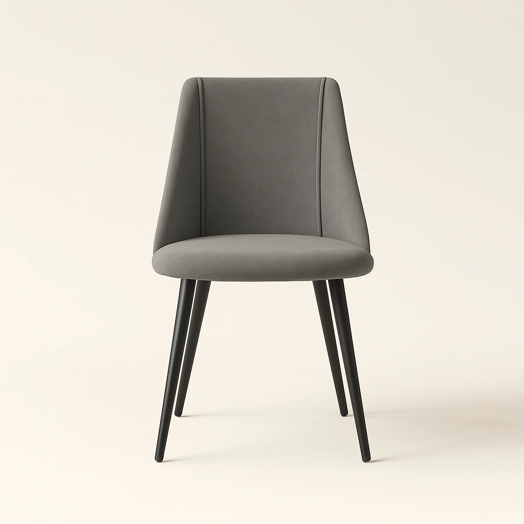 Elegant modern dining chair upholstered in navy blue velvet with minimal seam accents and matte black tapered metal legs. Ideal for dining, study, or office use.