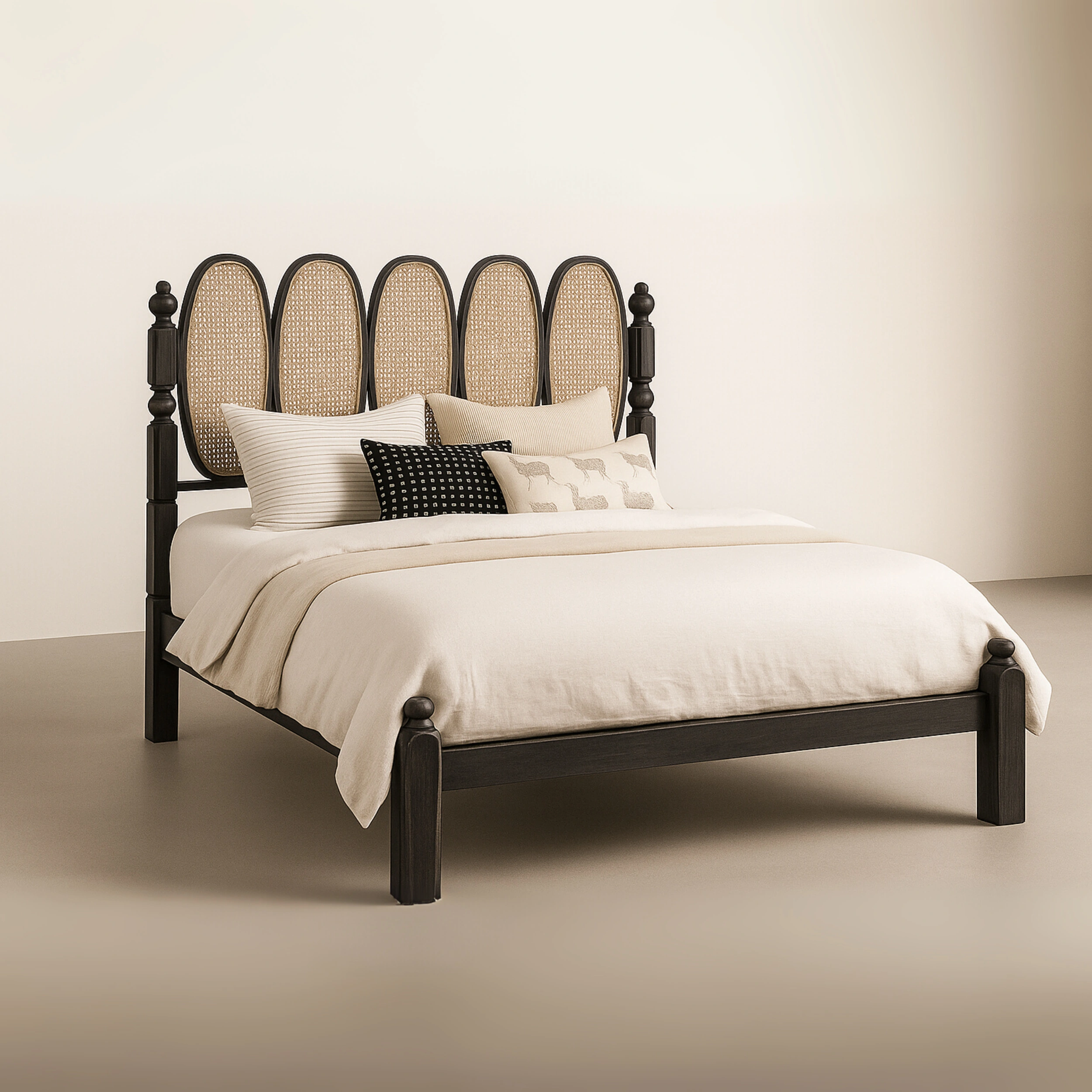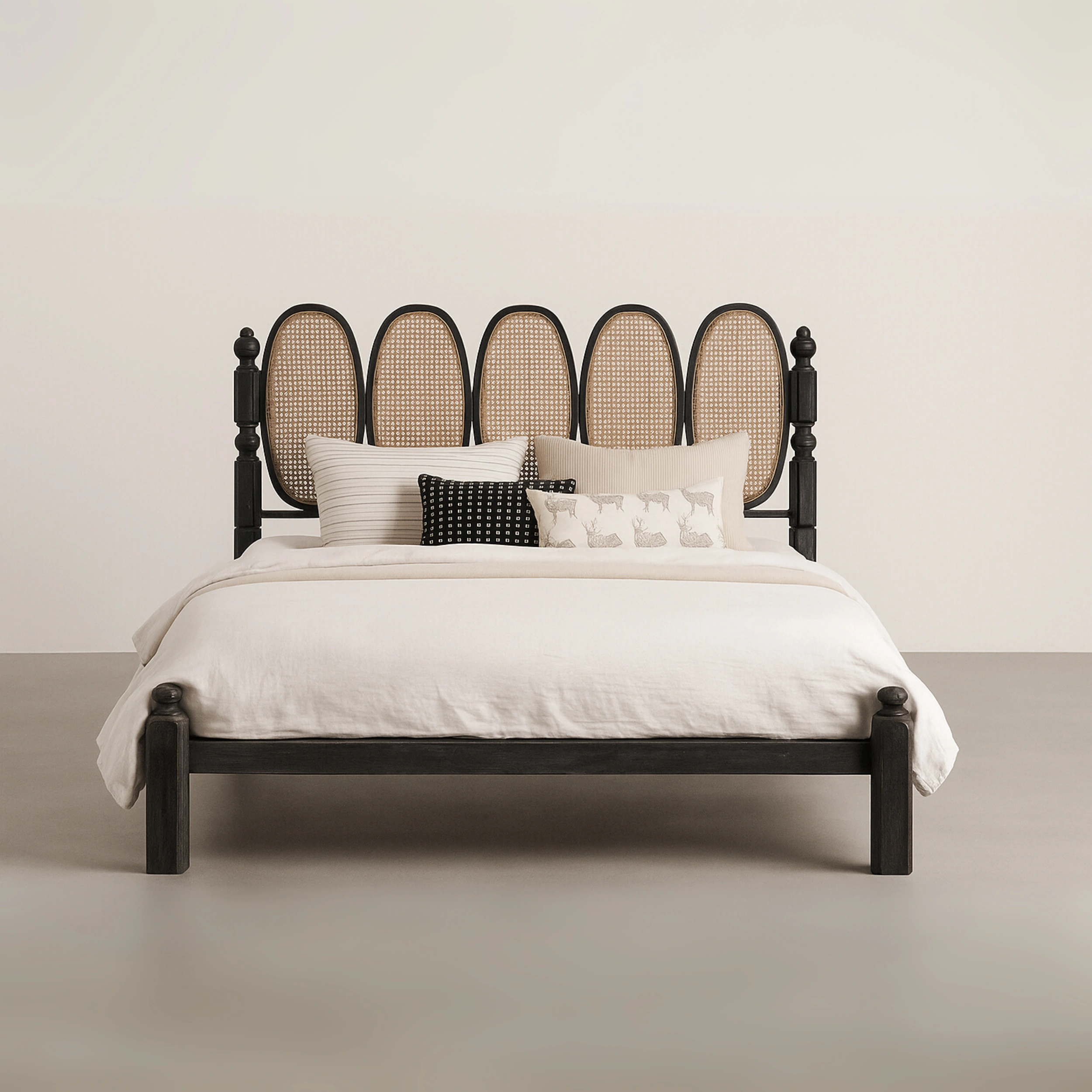 A charming blend of heritage craftsmanship and modern minimalism, this bed features a distinctive arched cane-back headboard framed in solid wood with turned spindle posts. Its clean silhouette, artisan feel, and use of natural materials make it ideal for boho, coastal, vintage-inspired, or eclectic interiors.