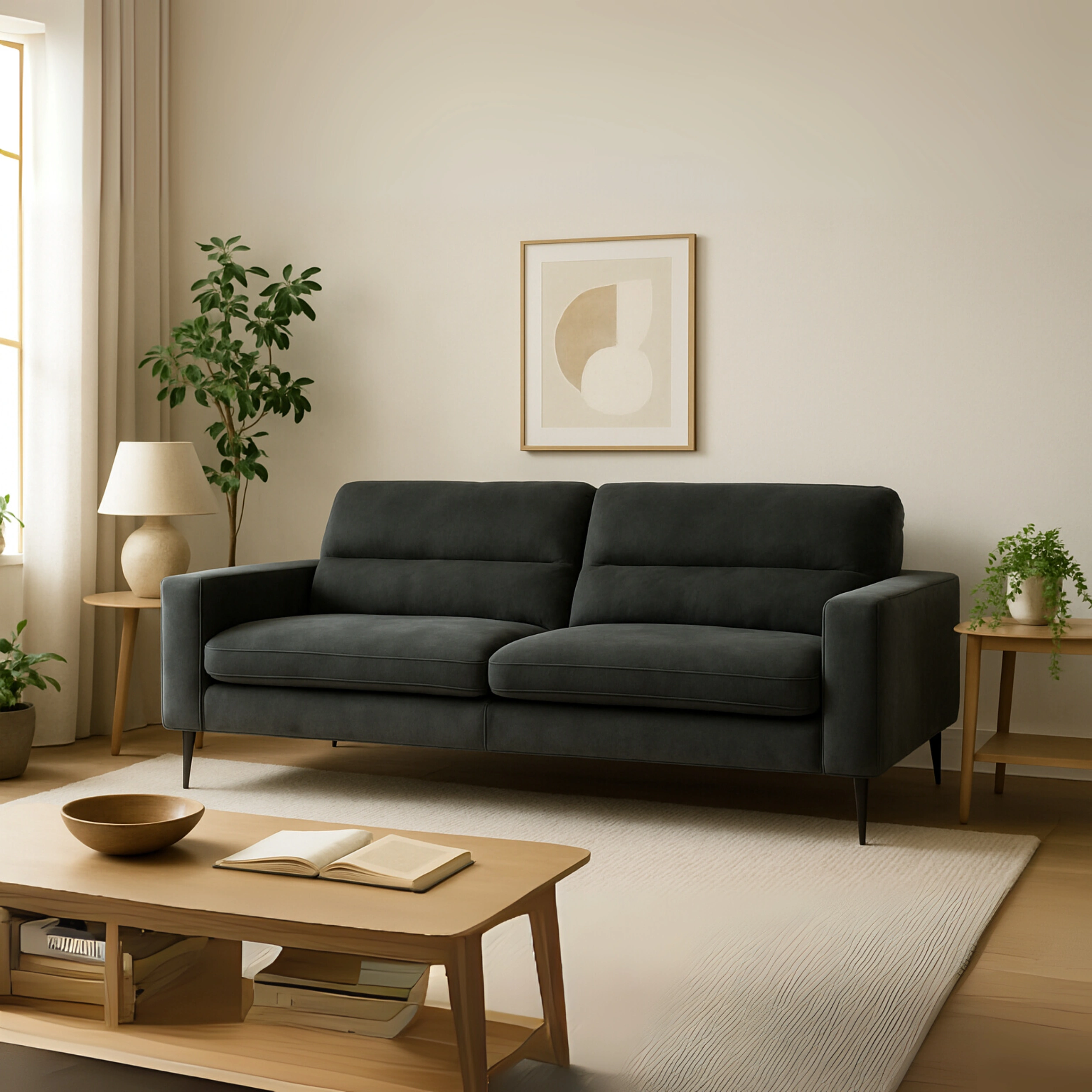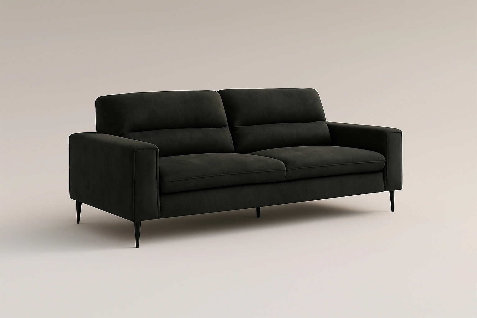 This contemporary 3-seater sofa combines clean lines with deep cushioning, making it a perfect fit for modern interiors. Upholstered in rich black fabric, it features plush seating, supportive backrests, and sleek metal legs that add a refined, lightweight look. Its compact frame and minimal detailing make it suitable for urban homes, studios, or offices.