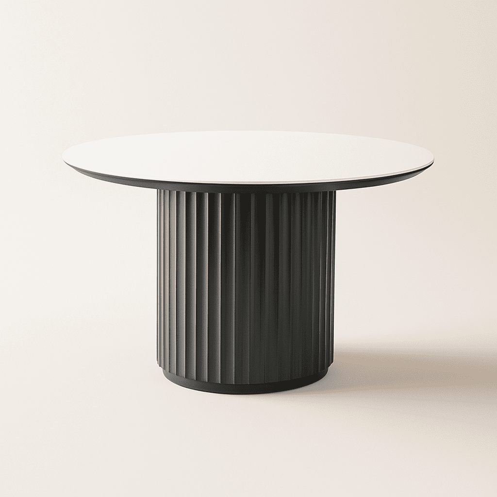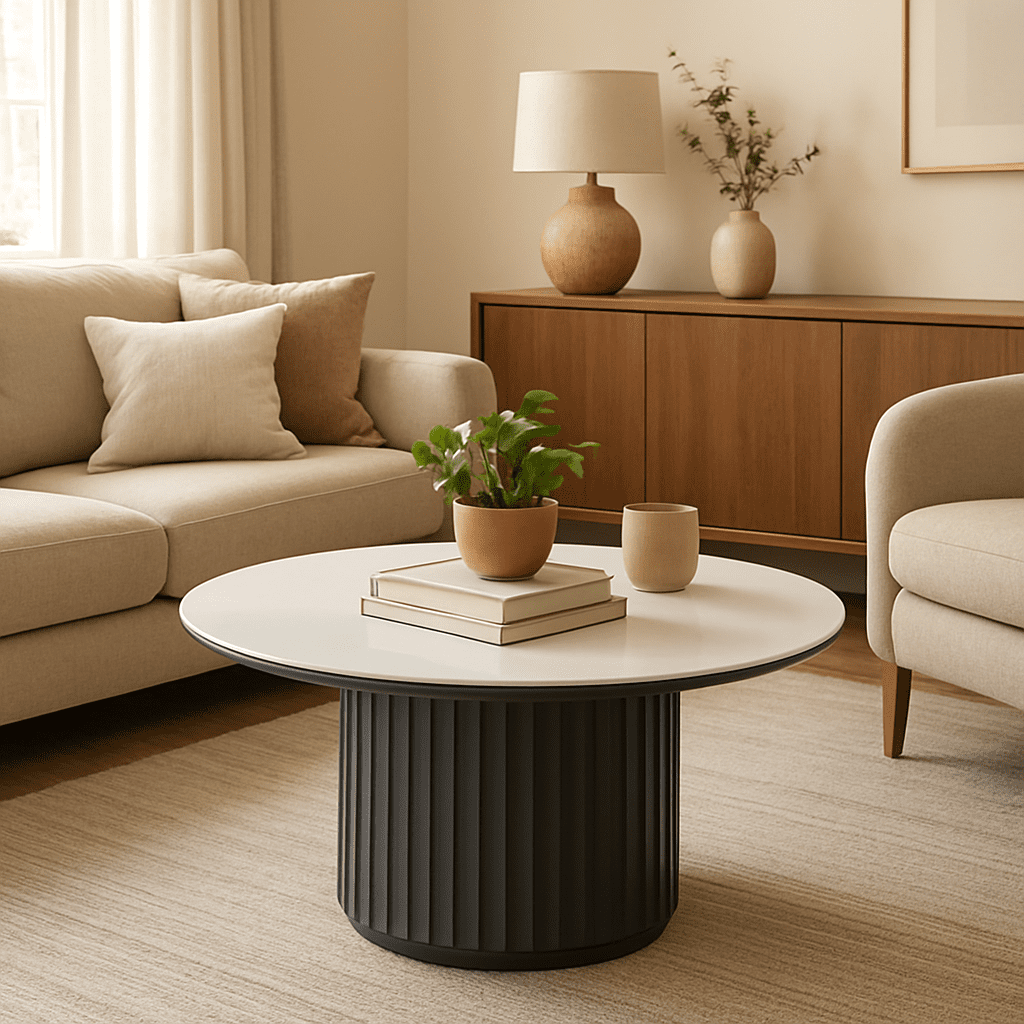 With its minimalist form and rich detail, the Nexa white ceramic coffee table makes a refined centrepiece in any living area. Its smooth, durable white ceramic top has a subtle stone effect, adding a touch of elegance to this practical piece. The round top creates a sense of flow, while the eye-catching black fluted pedestal base provides a lovely contrast and a sturdy foundation. This single-column design is both beautiful and stable. Display a favourite sculpture or use it as a functional surface for daily use. The Nexa coffee table’s versatile neutral palette complements various interior styles. Coordinate it with a patterned rug and matching side tables for a cohesive aesthetic. It fits seamlessly in living rooms, family rooms, or open-plan spaces.