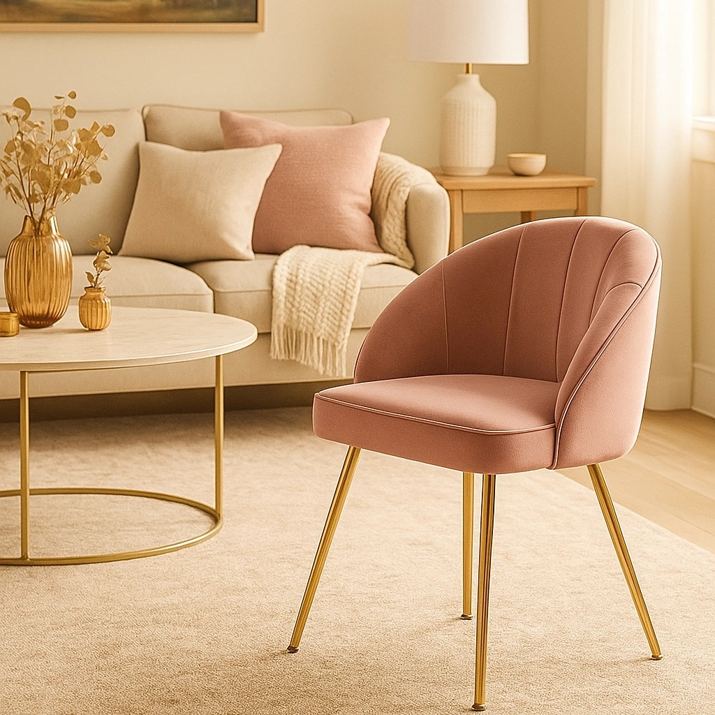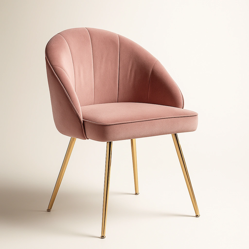 Elegant accent chair upholstered in blush pink velvet, featuring a curved barrel back design and gold-finished metal legs. Perfect for vanity corners, lounges, or reception spaces.
