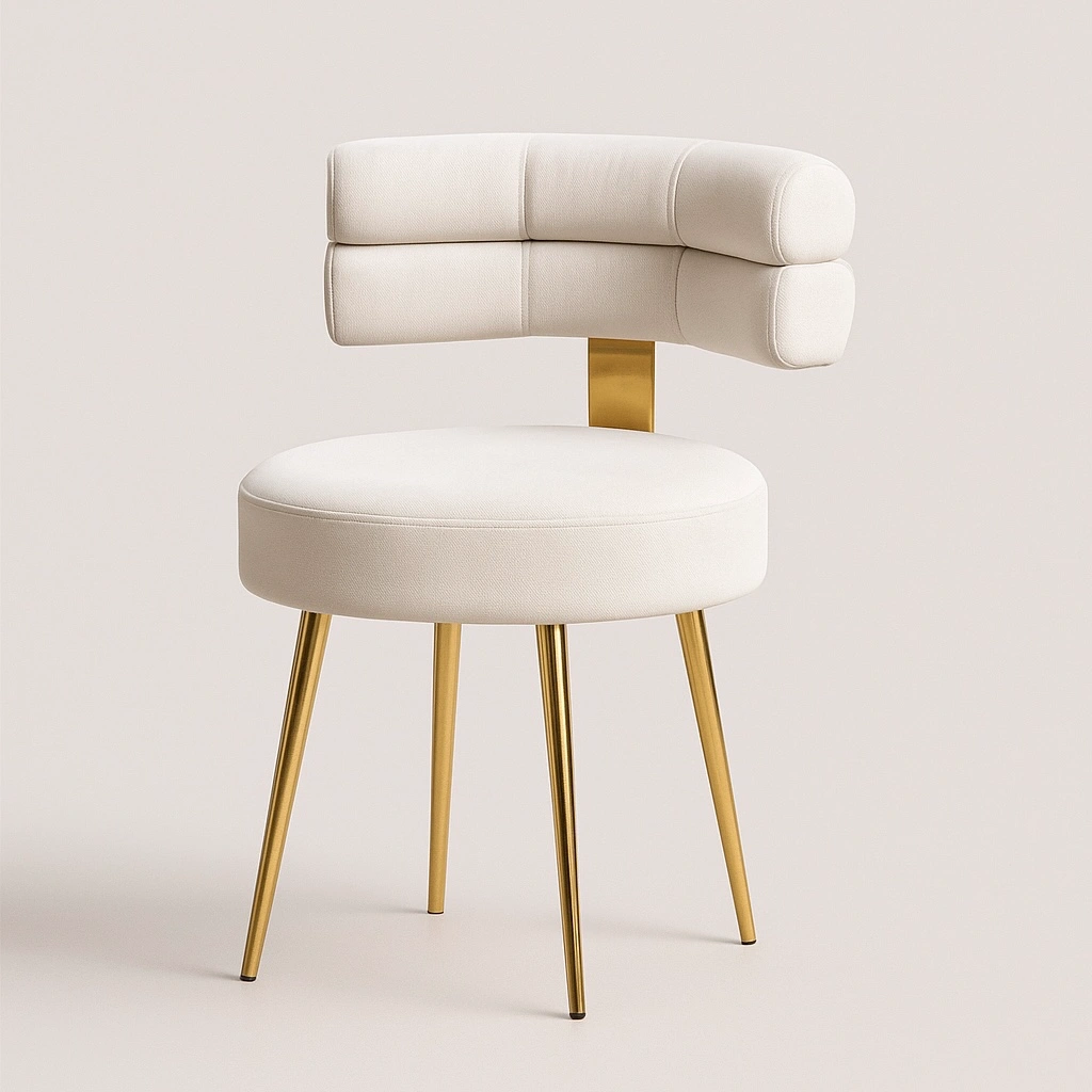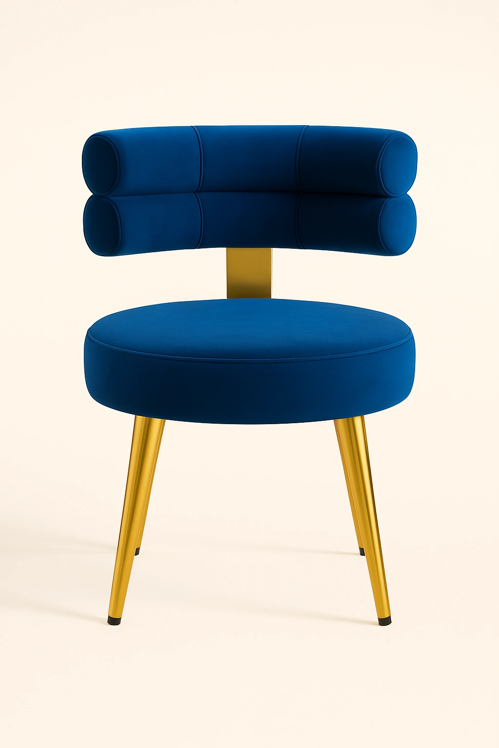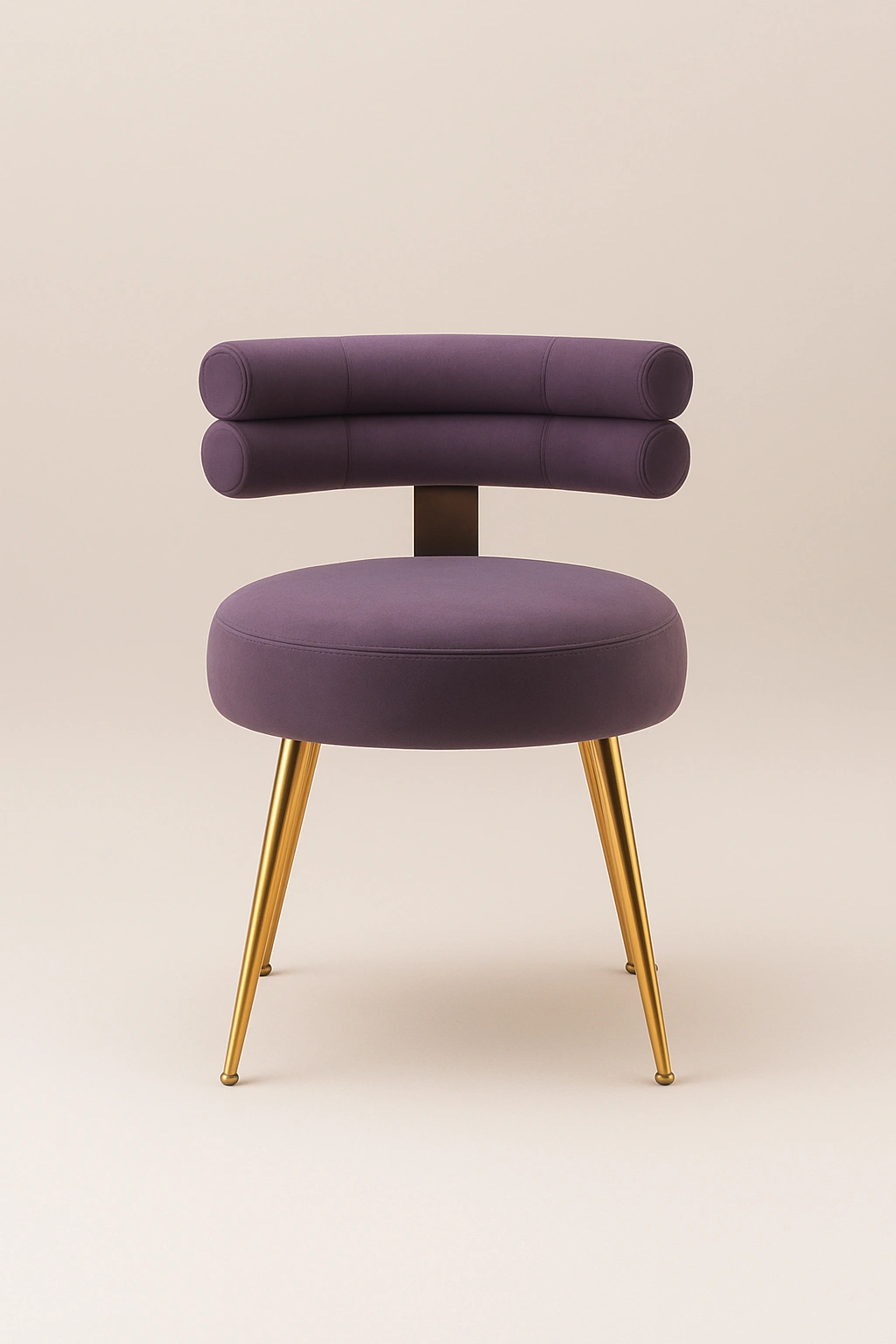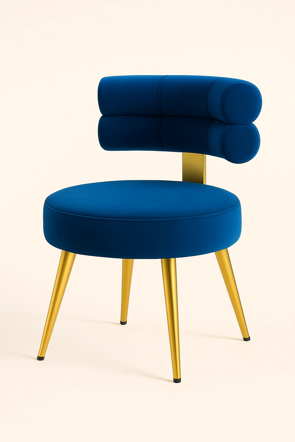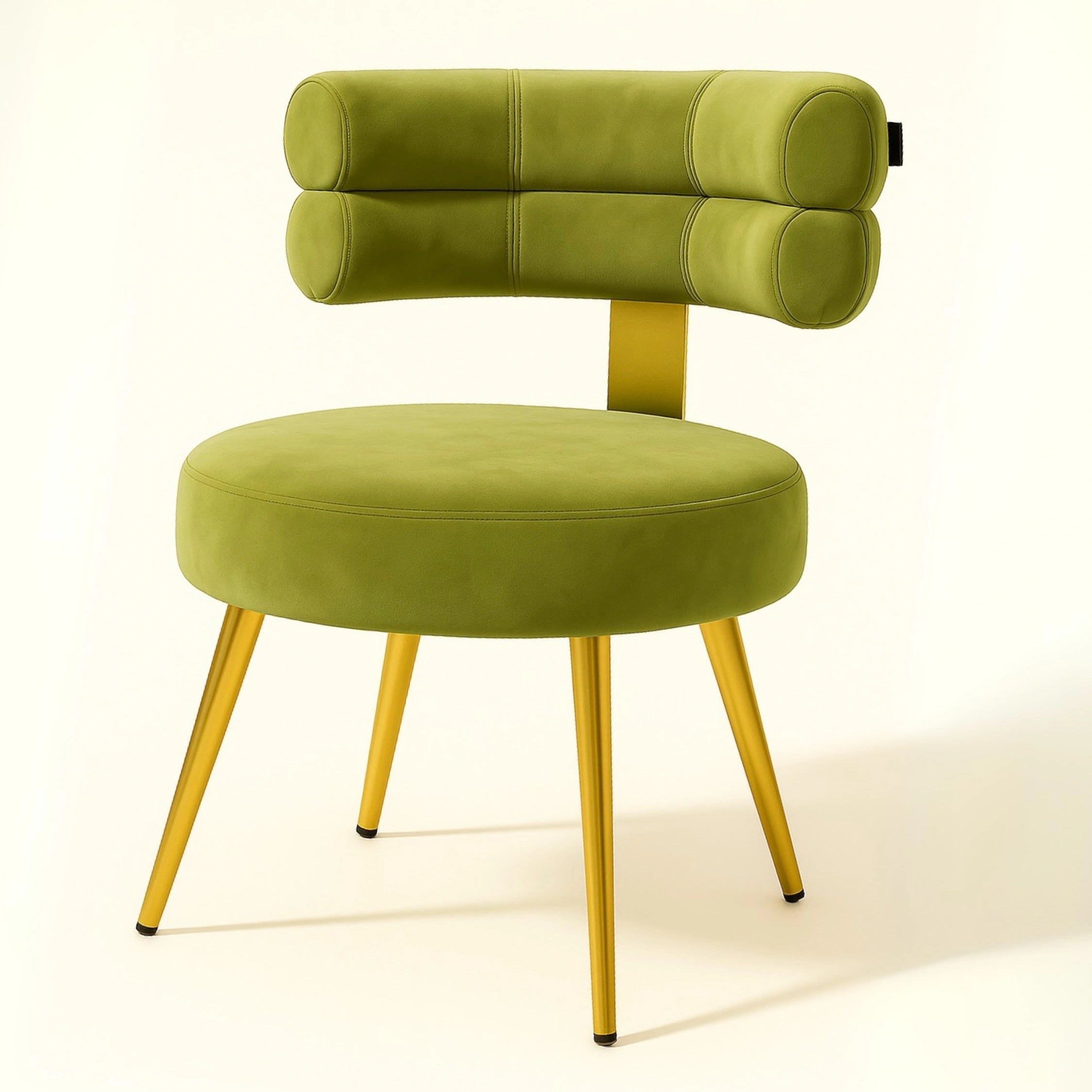 This stylish accent chair blends modern luxury with functional elegance. Featuring a unique cylindrical dual-roll backrest design, it offers an artistic flair perfect for premium interiors such as vanity corners, lounge spaces, or boutique setups. The chair is upholstered in rich velvet fabric, delivering a soft touch and high visual appeal. The round cushioned seat offers comfortable seating, while the sleek tapered metal legs in a polished gold finish elevate its sophisticated charm