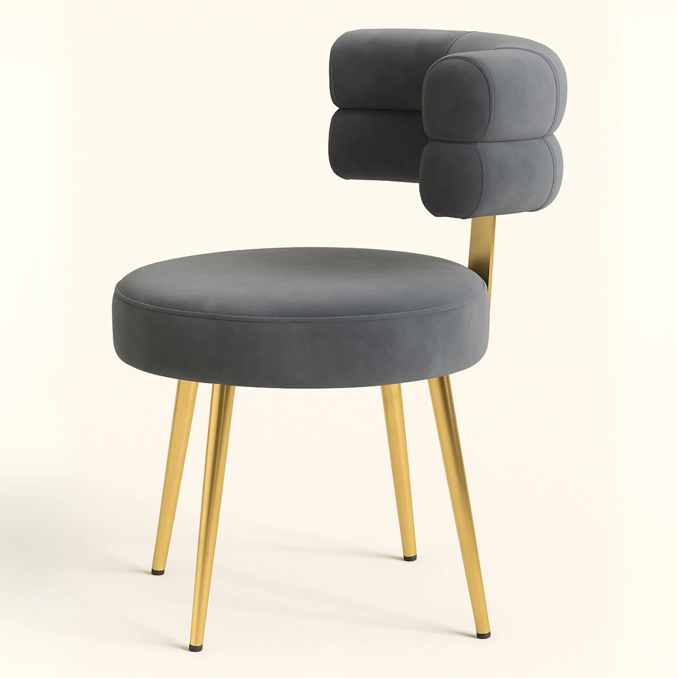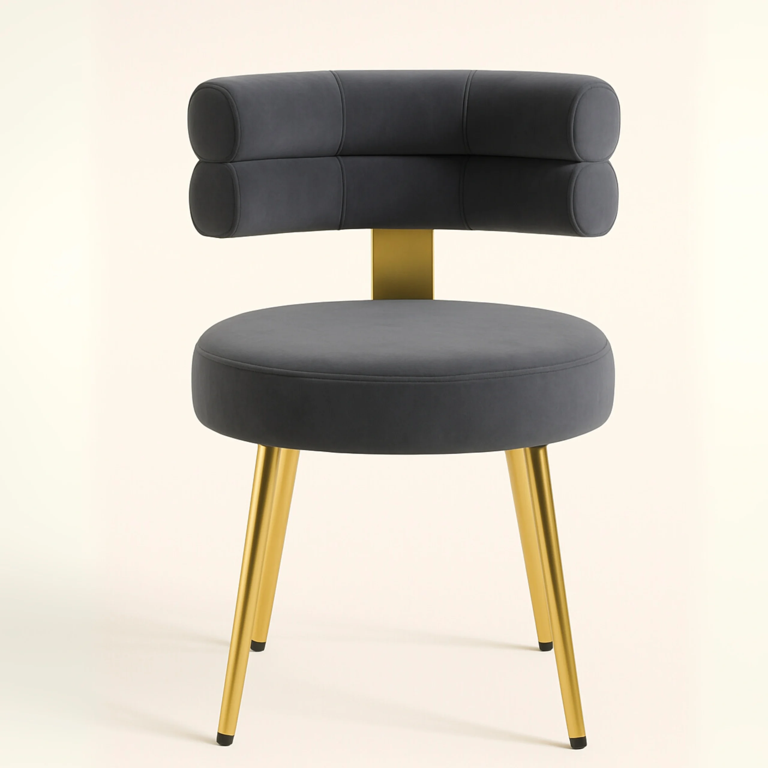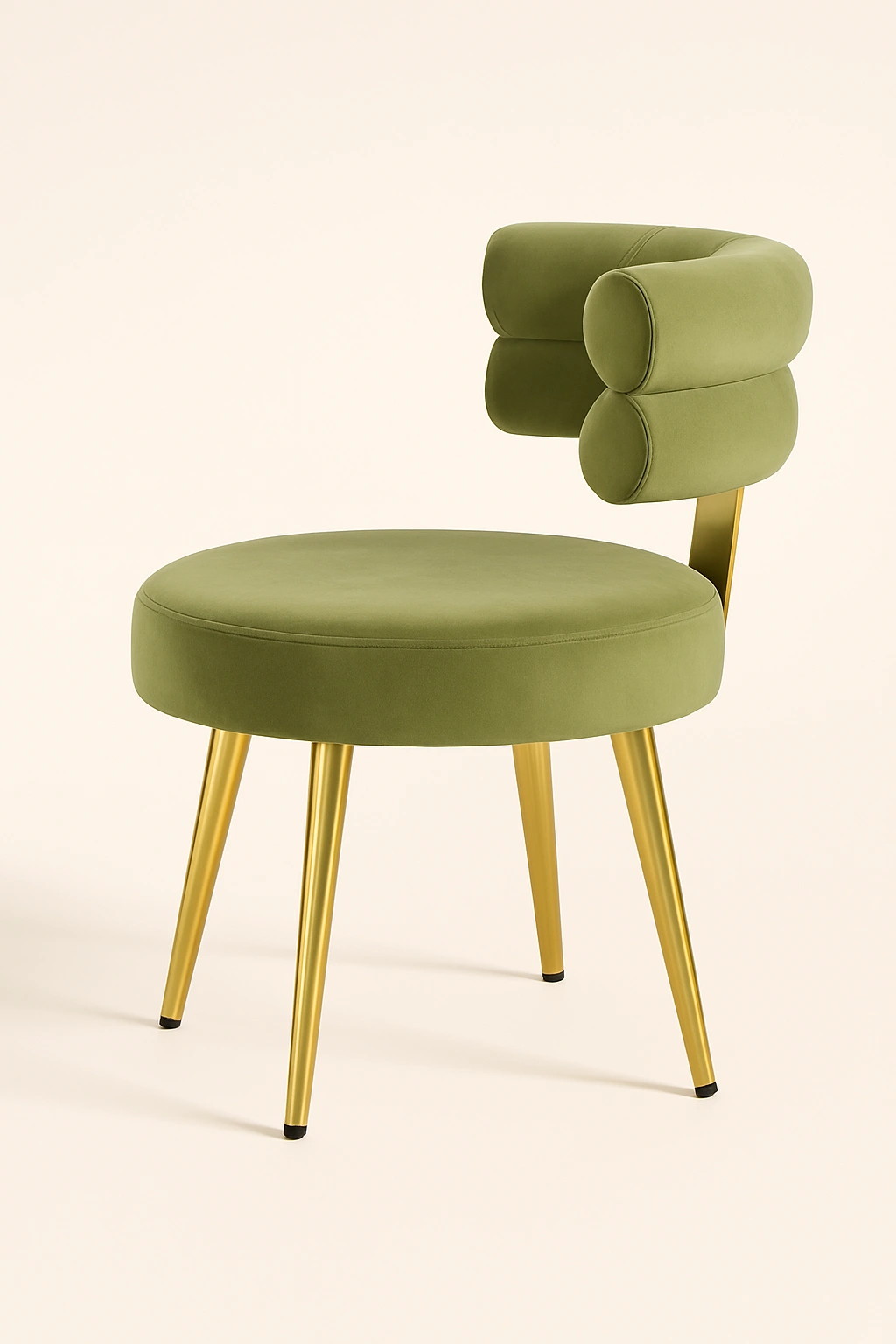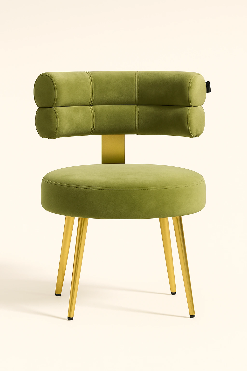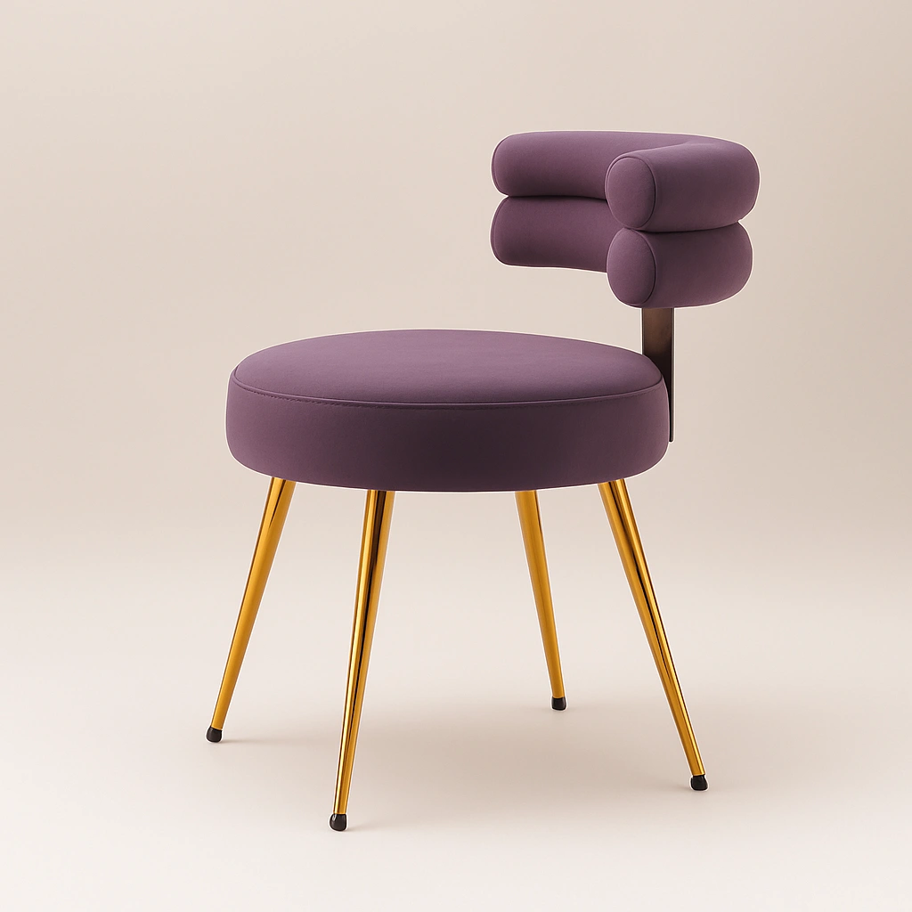 This stylish accent chair blends modern luxury with functional elegance. Featuring a unique cylindrical dual-roll backrest design, it offers an artistic flair perfect for premium interiors such as vanity corners, lounge spaces, or boutique setups. The chair is upholstered in rich velvet fabric, delivering a soft touch and high visual appeal. The round cushioned seat offers comfortable seating, while the sleek tapered metal legs in a polished gold finish elevate its sophisticated charm