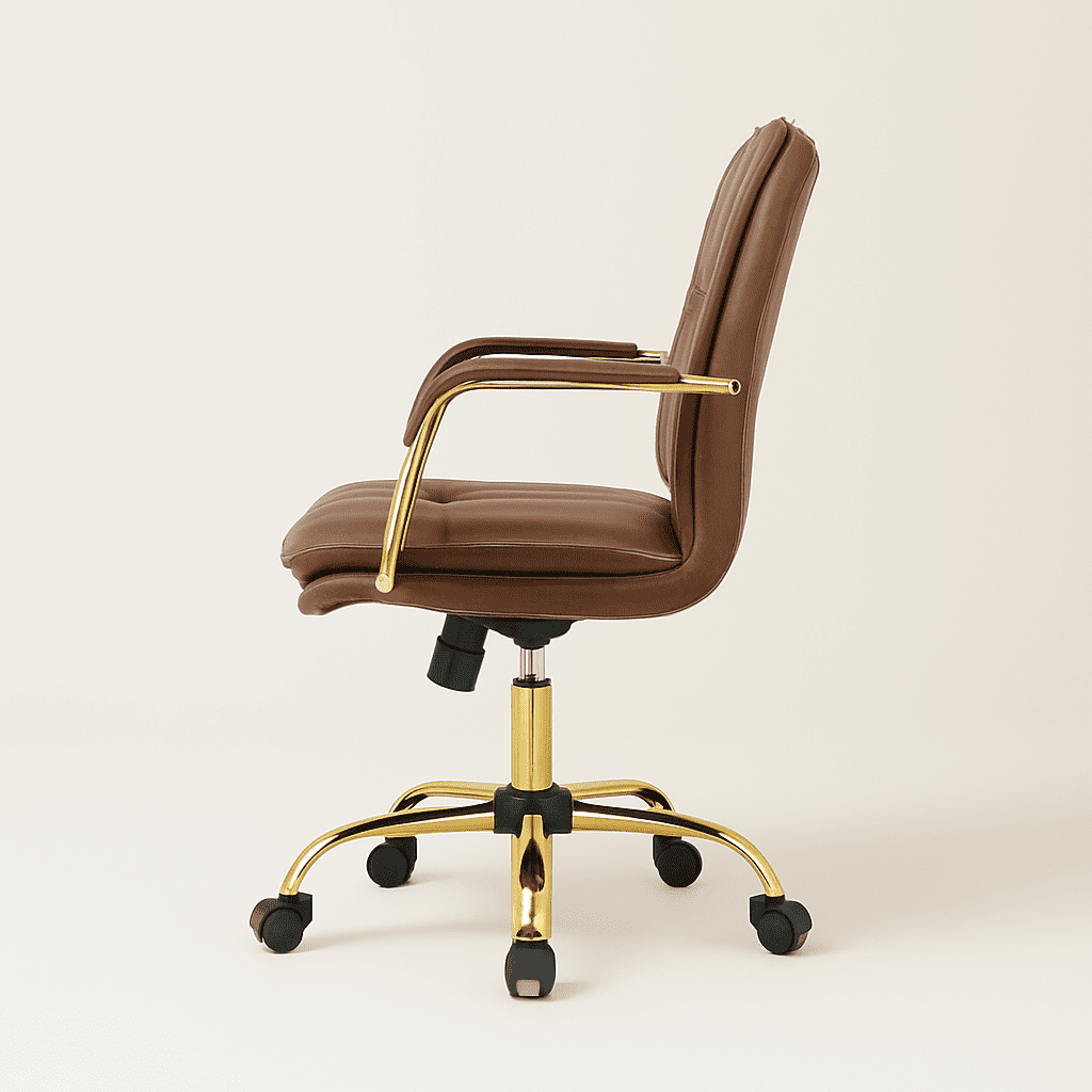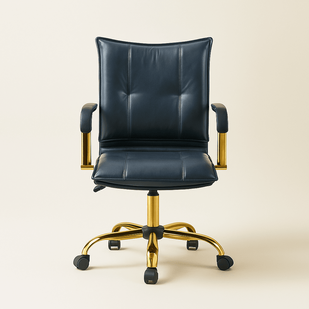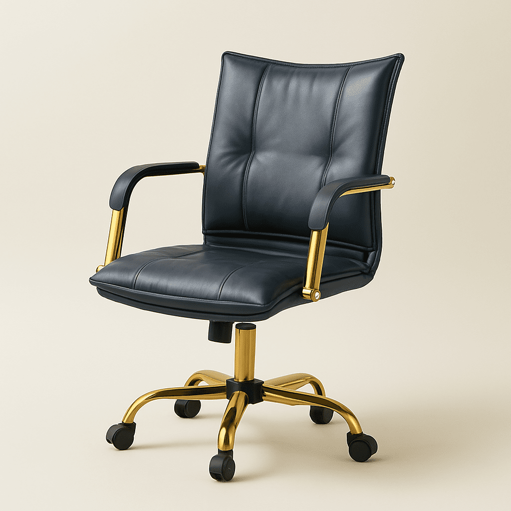 This vintage-inspired boss office chair features a gently ribbed backrest, cushioned seat, and plush armrests in gold accents to ensure all-day support in style while smooth-rolling casters provide seamless mobility. Perfect for home offices and creative workspaces, this black executive chair online blends durability, comfort, and style—without compromising affordability.
