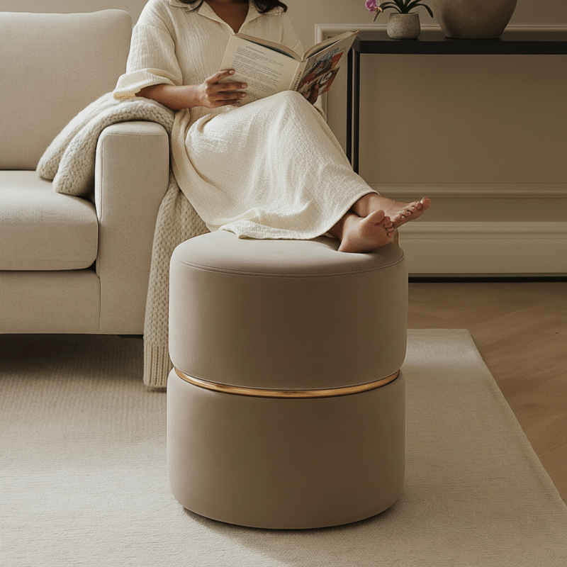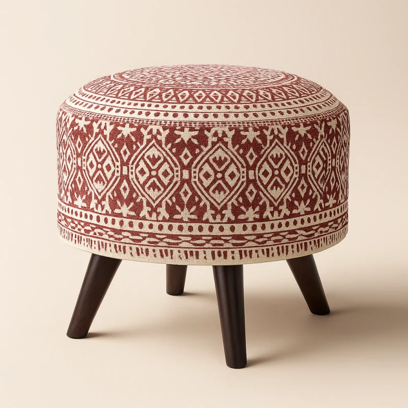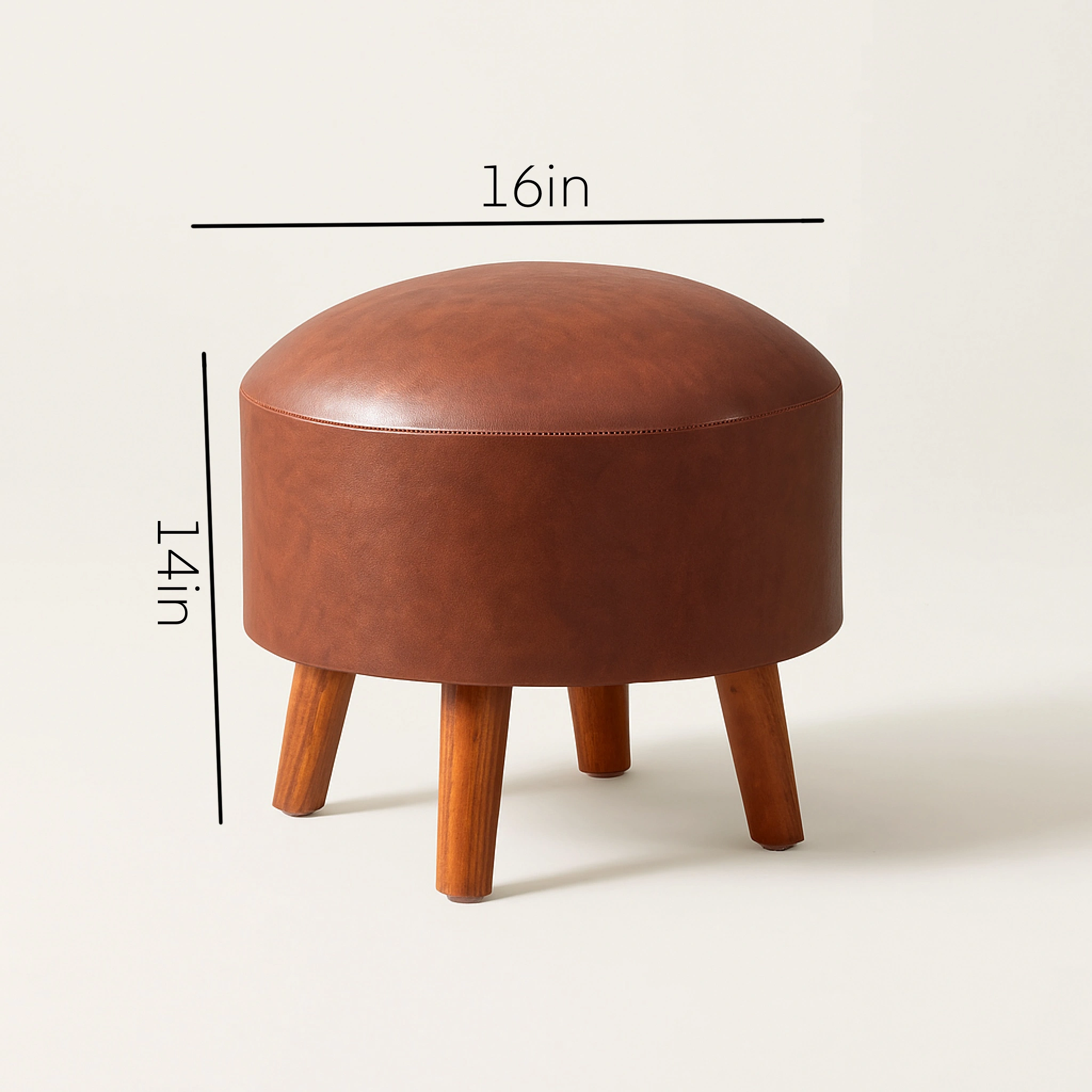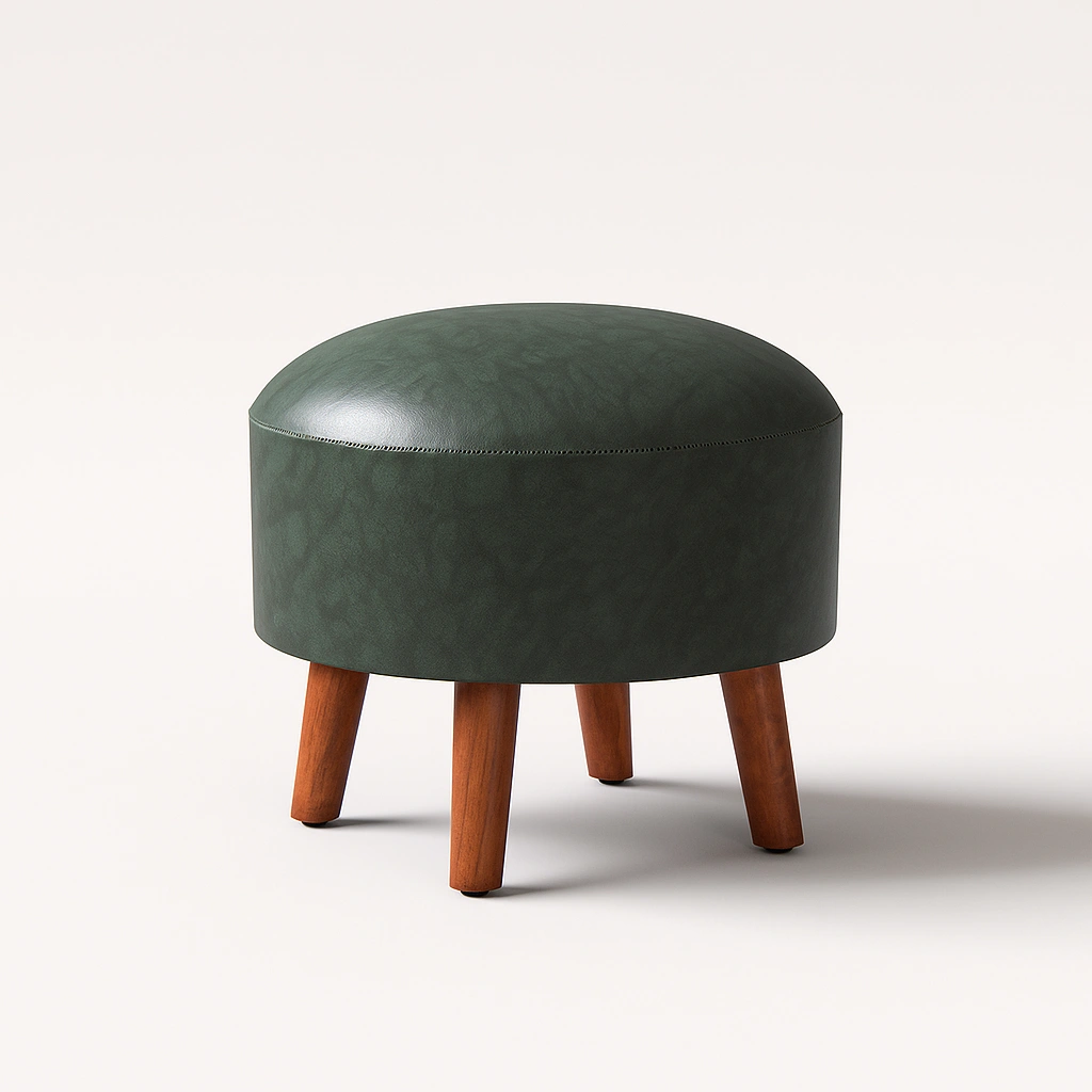 This contemporary round pouf features a smooth, dome-shaped top that offers a minimalist and refined aesthetic. Upholstered in a rich leatherette, the pouf has a clean silhouette that pairs well with various interior styles—from rustic to modern. The gently angled solid wood legs provide stability and a warm contrast, making it ideal for use as a footrest, extra seating, or an accent piece in living spaces or bedrooms.