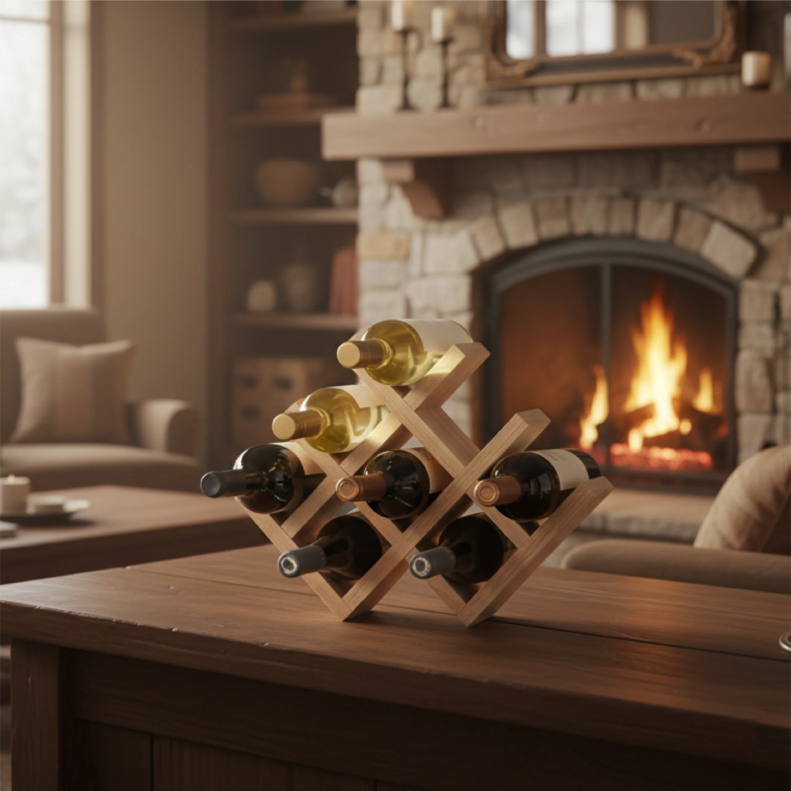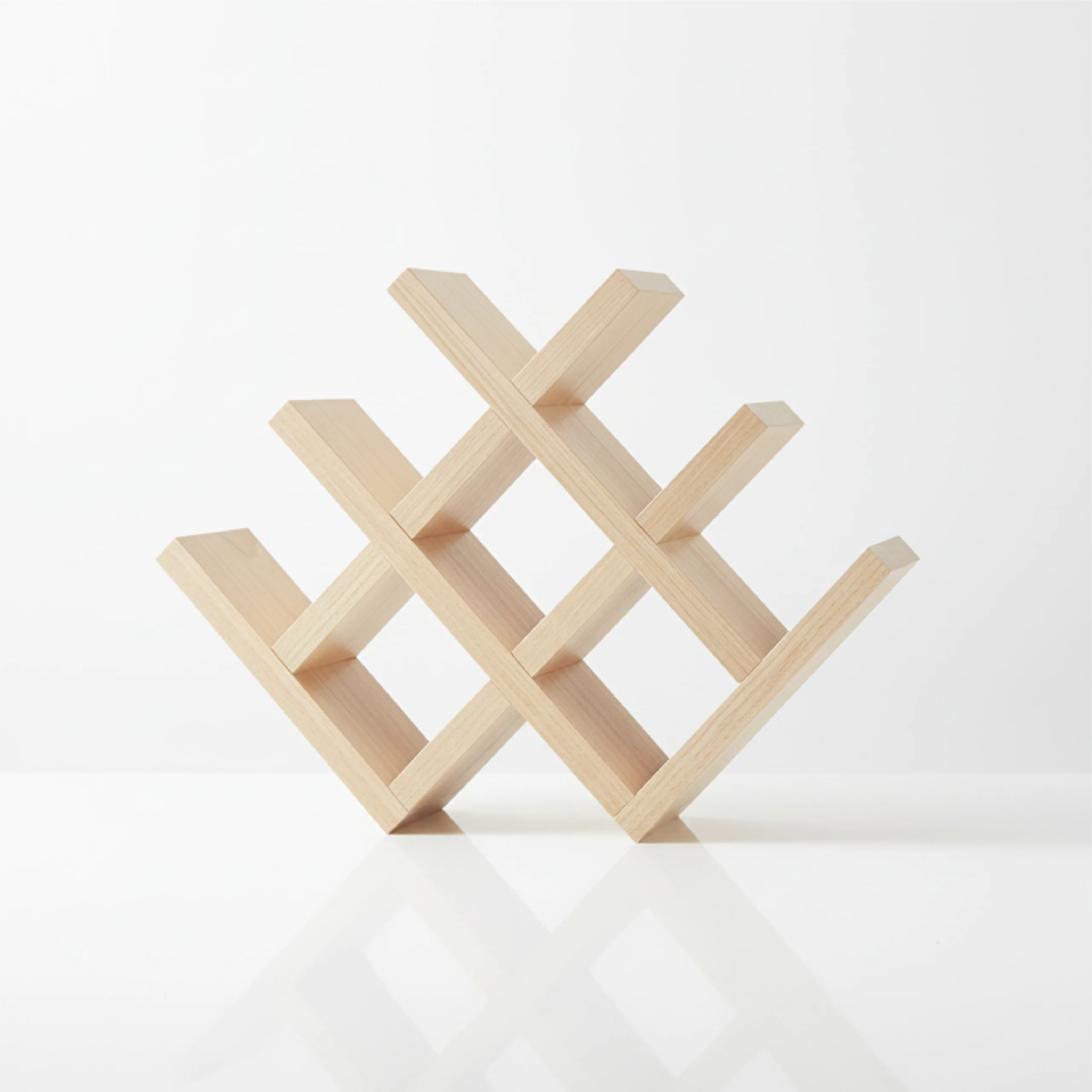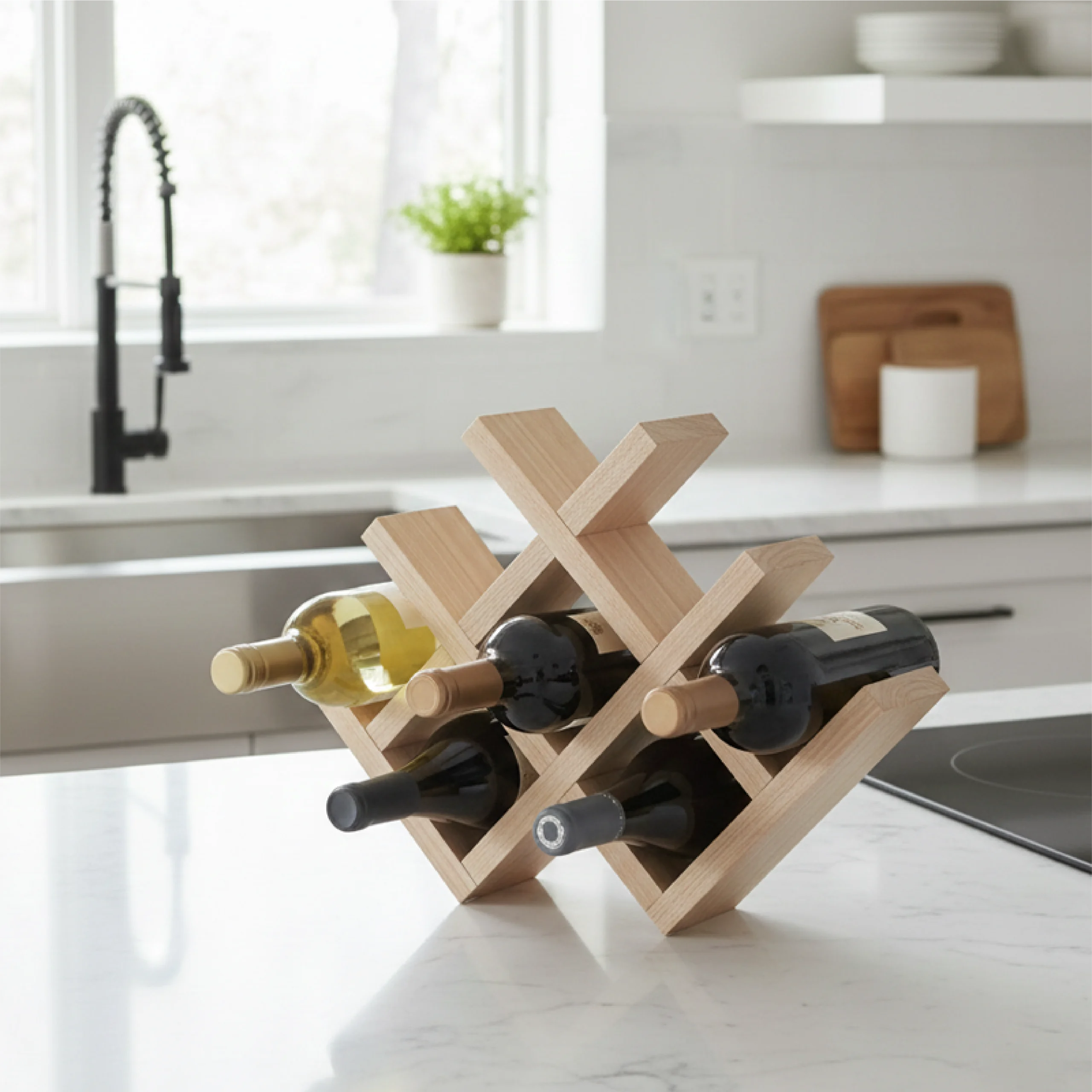 The Rovino Wine Rack is a minimalist tabletop solution designed for stylish and practical wine storage. Crafted from solid wood, its interlocking X-frame structure securely holds bottles in a horizontal position, helping preserve cork quality while showcasing your collection. Compact yet visually striking, Rovino is ideal for kitchen counters, dining tables, or home bar setups.