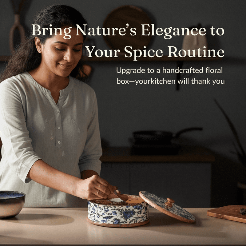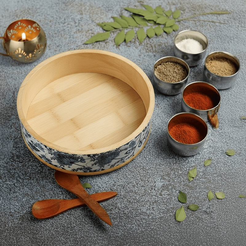 Bring elegance and tradition together in your kitchen with the Sattva Masala Box. Designed with a timeless blue floral print on a smooth ceramic exterior, this masala box adds charm while keeping your everyday spices fresh and organized. The natural wooden rim and lid provide a warm contrast, while the neatly arranged inner containers ensure easy access during cooking.
