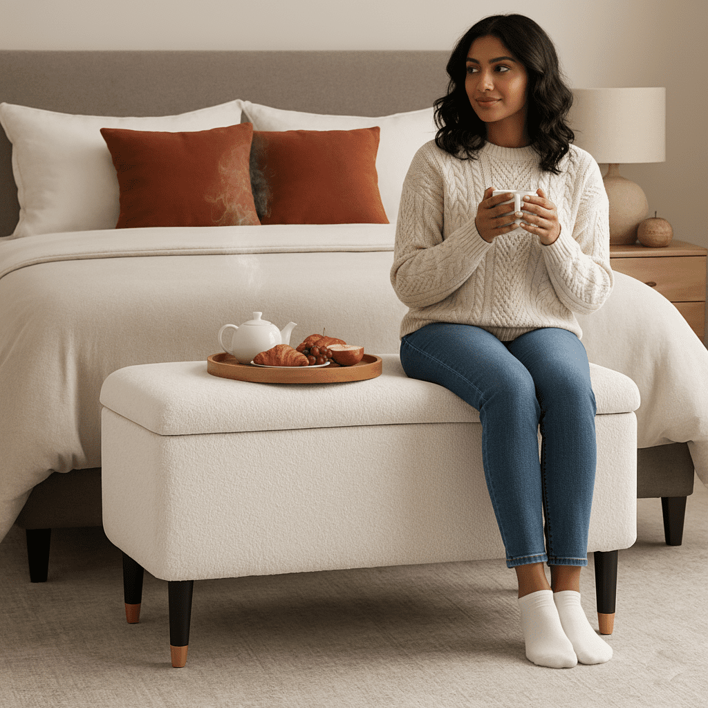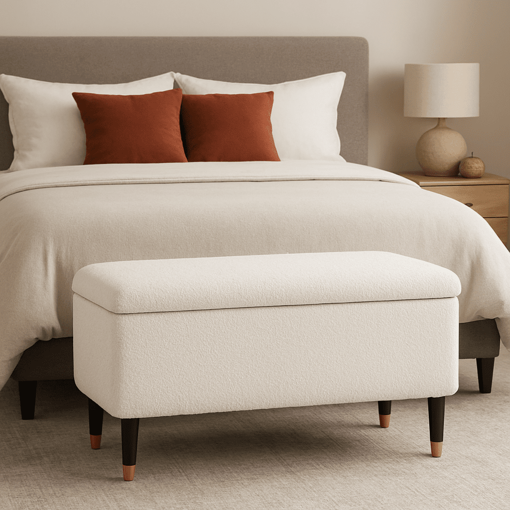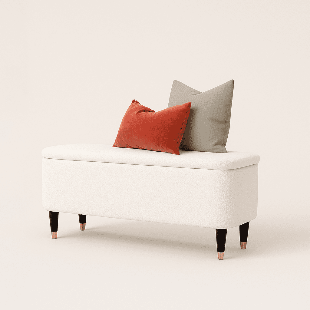 The on-trend Sivra storage bench is a stylish and practical addition to any bedroom or living space. Upholstered in a luxuriously soft, textured boucle fabric in a sophisticated ivory hue, this elegant bench sits atop cylindrical legs with gleaming brass-capped ends, adding a touch of contemporary glamour. The spacious interior provides ample storage for extra bedding, blankets, or anything you wish to keep tucked away, while the clever ventilated design ensures optimal airflow. Style the Sivra bench at the foot of your bed with a coordinating rug and plush cushions, or place it in your hallway alongside a statement mirror and a sleek side table to create a welcoming entrance. Perfect for bedrooms, hallways or living rooms, the sivra storage bench effortlessly combines style and functionality.