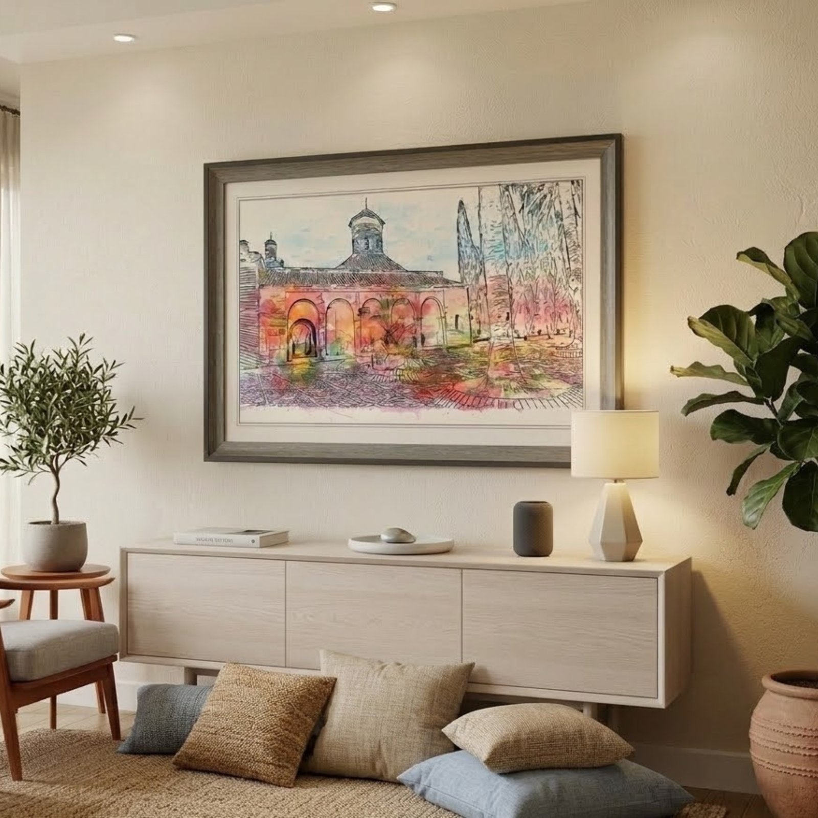 Bring warmth, charm, and artistic elegance to your walls with “Sunset Courtyard” Vintage European Architecture Wall Art. This beautifully illustrated artwork captures a peaceful courtyard scene featuring classic arched architecture, charming rooftops, and vibrant watercolor accents that evoke the beauty of old European towns.