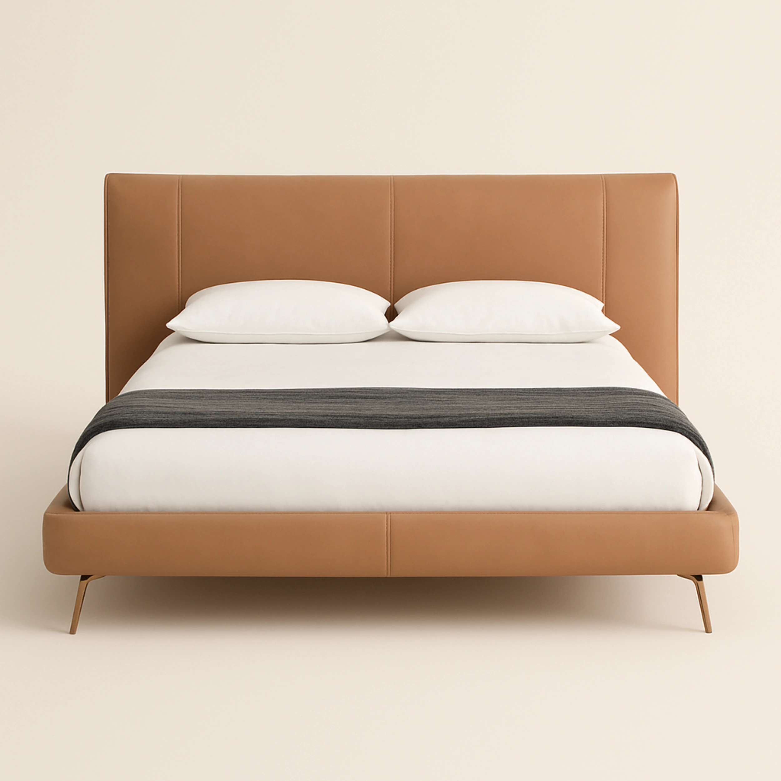 A sleek, low-profile bed with a smooth leatherette finish, curved padded headboard, and minimalist appeal. This bed is designed for modern luxury interiors, featuring soft-edge detailing, a seamless upholstered frame, and slender tapered metal legs for a floating appearance.