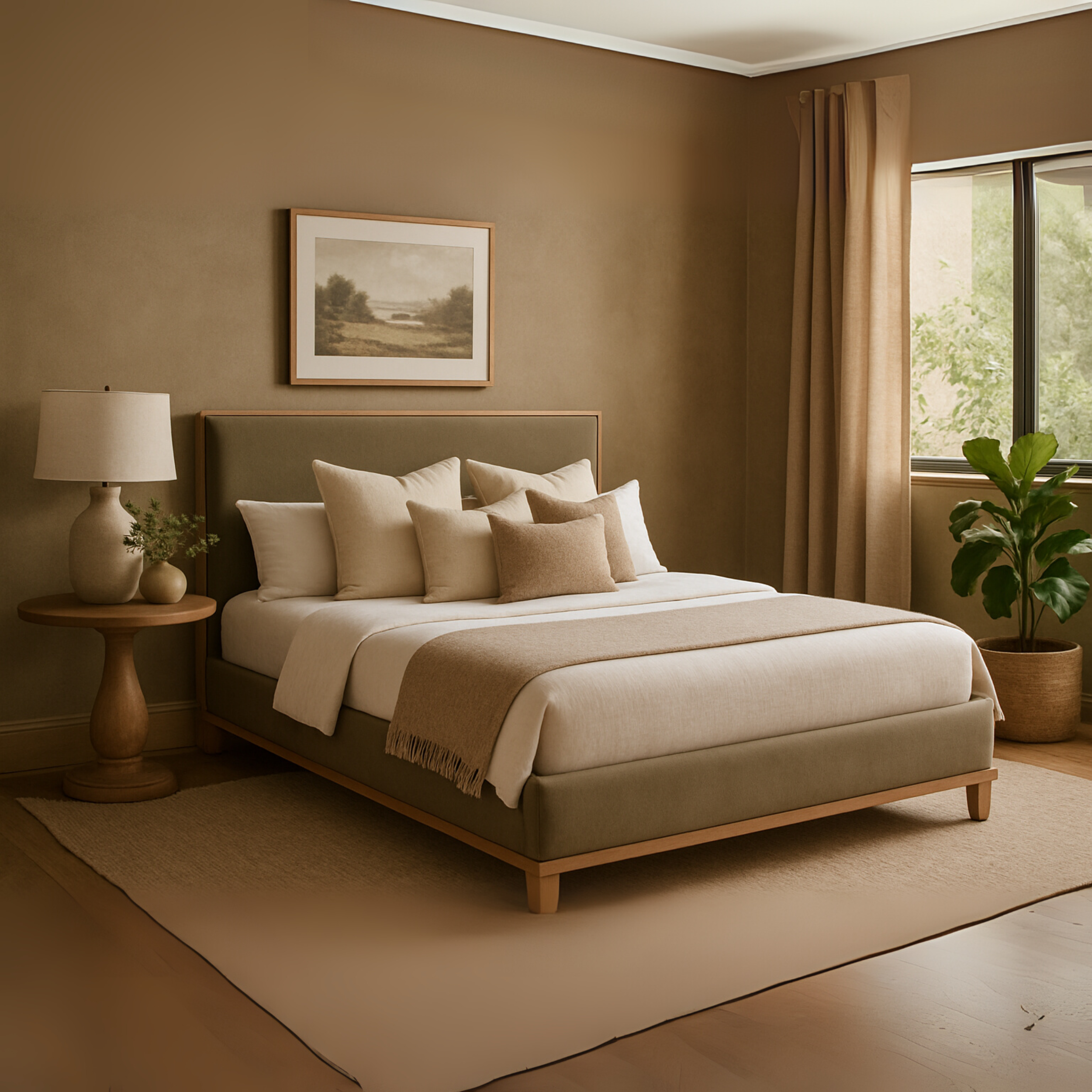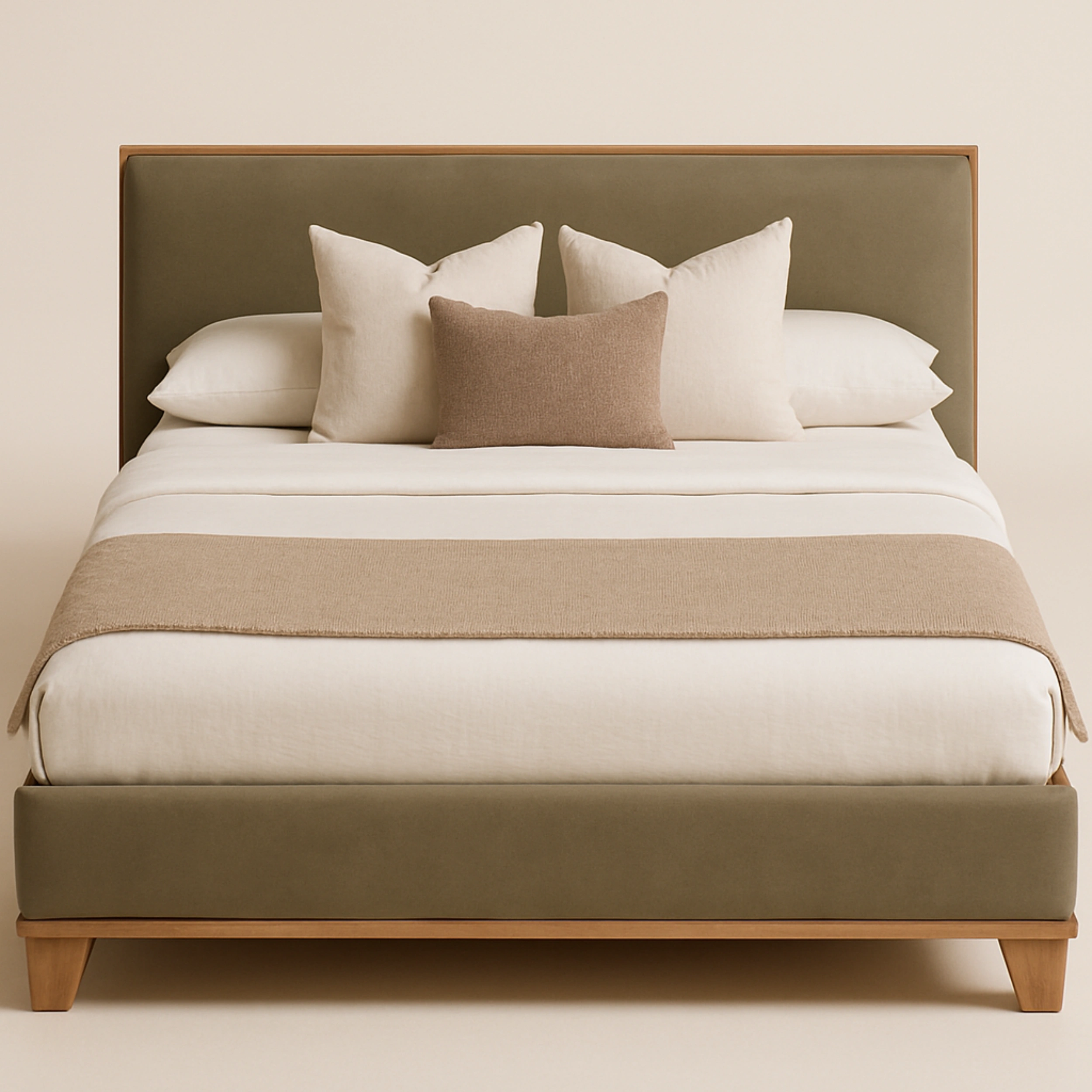 This bed combines clean modern lines with warm natural textures. The upholstered panels are bordered by exposed wooden framing for a refined and structured aesthetic. Elevated on short tapered legs, the design delivers a sense of lightness and balance, ideal for minimalist, Scandinavian, or contemporary interiors.
