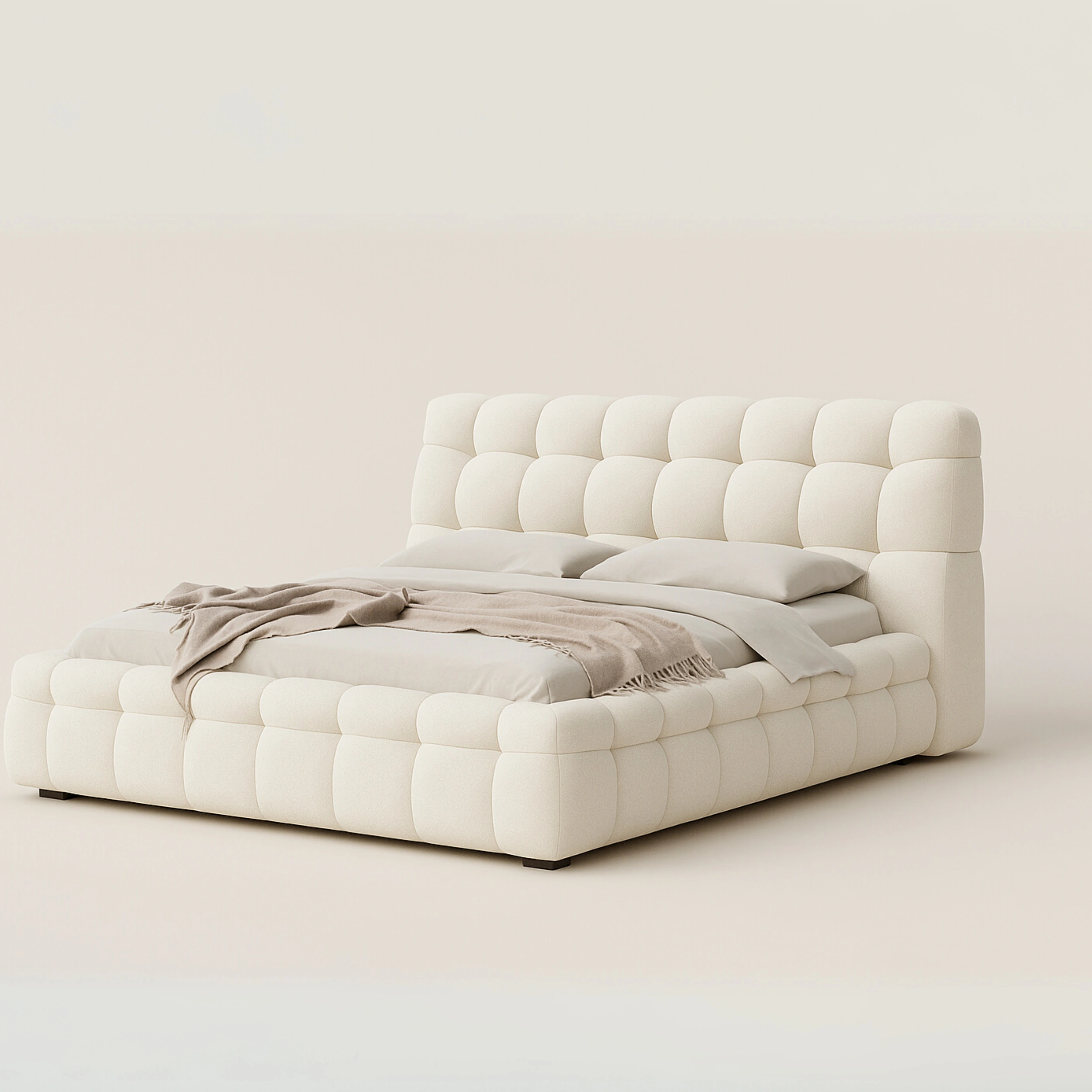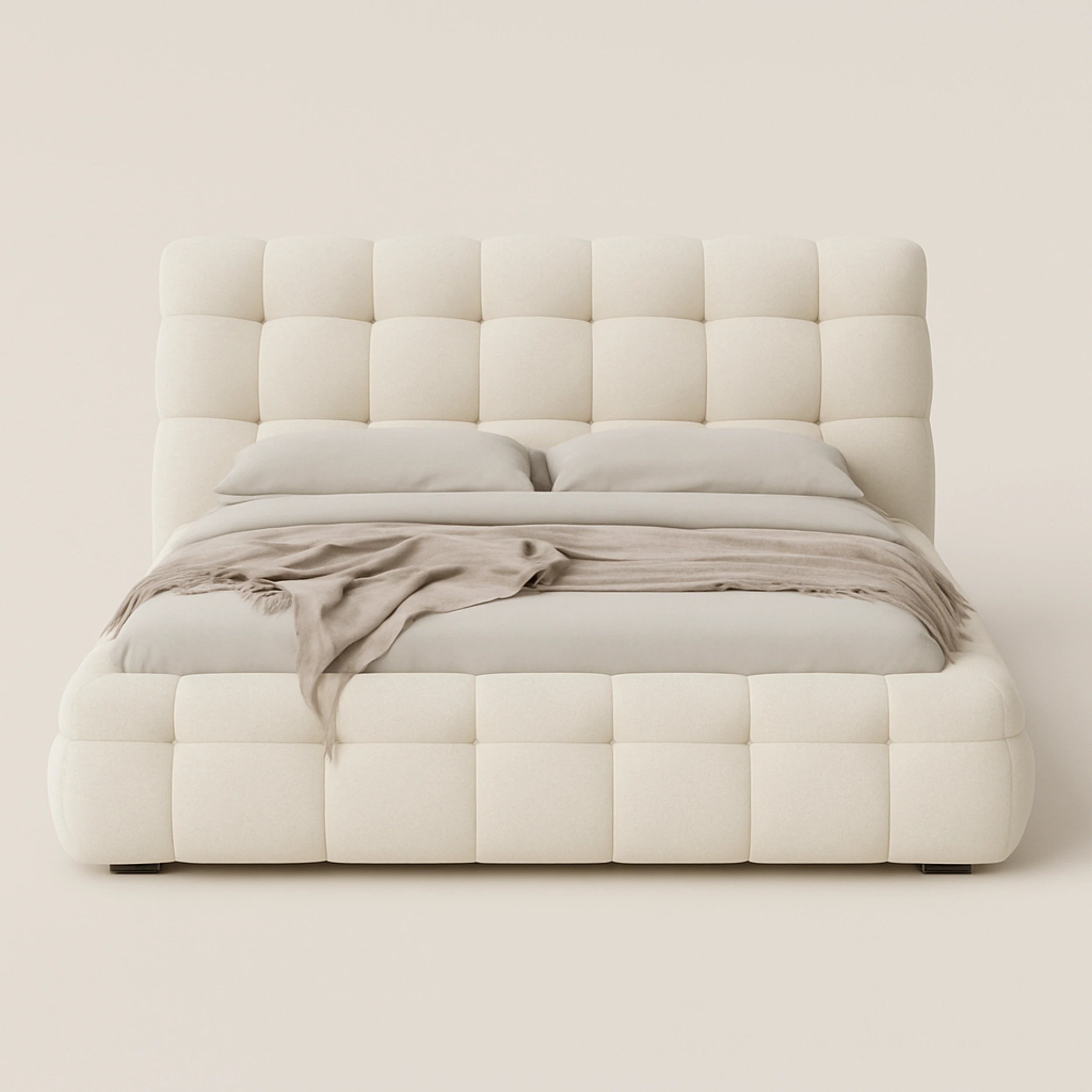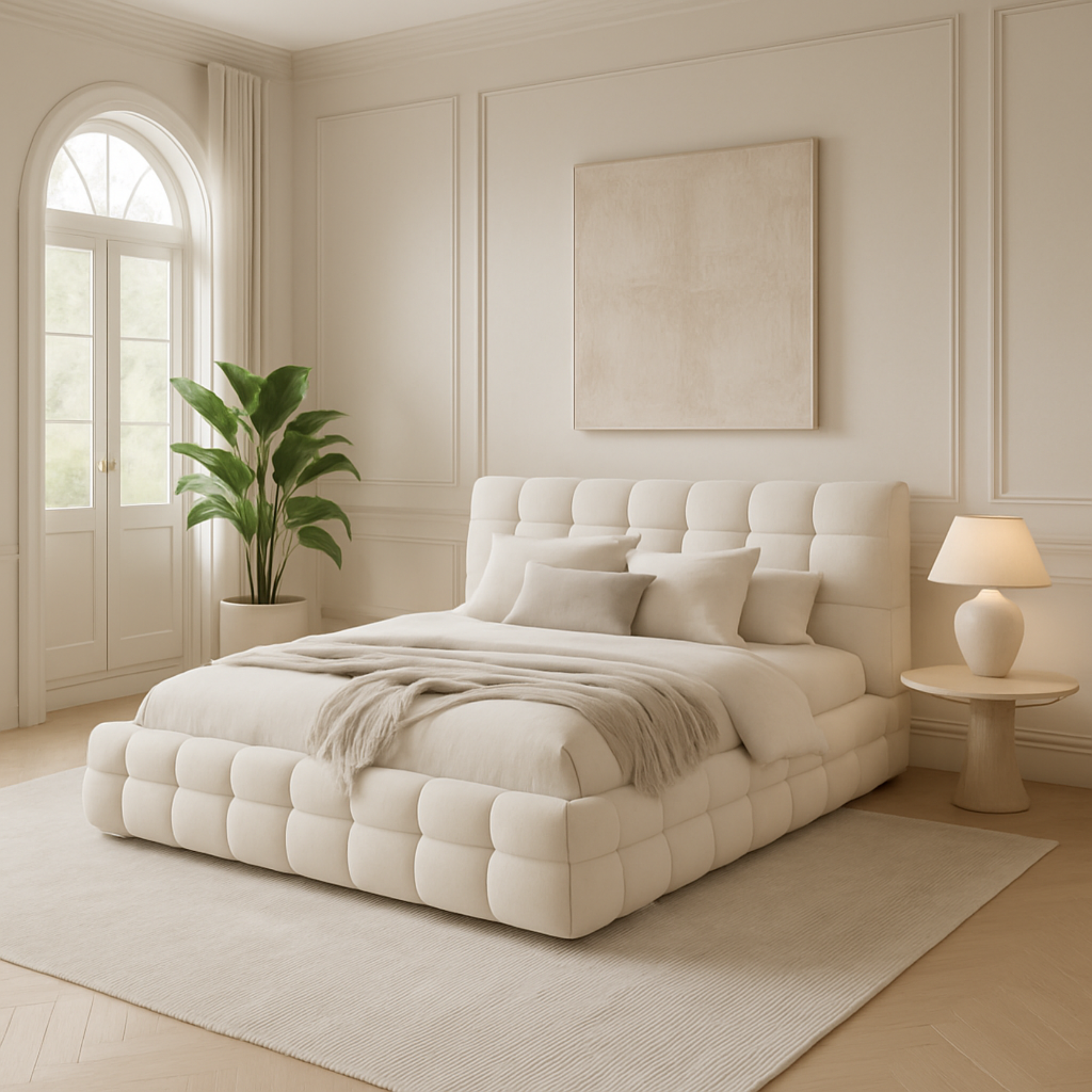 A statement bed designed for indulgent comfort and visual softness. Featuring an all-around tufted design with large pillowy square panels, this bed exudes luxury and a cloud-like aesthetic. The low-profile, fully padded frame wraps the mattress like a plush cocoon—perfect for contemporary luxury interiors or boutique-style bedrooms.