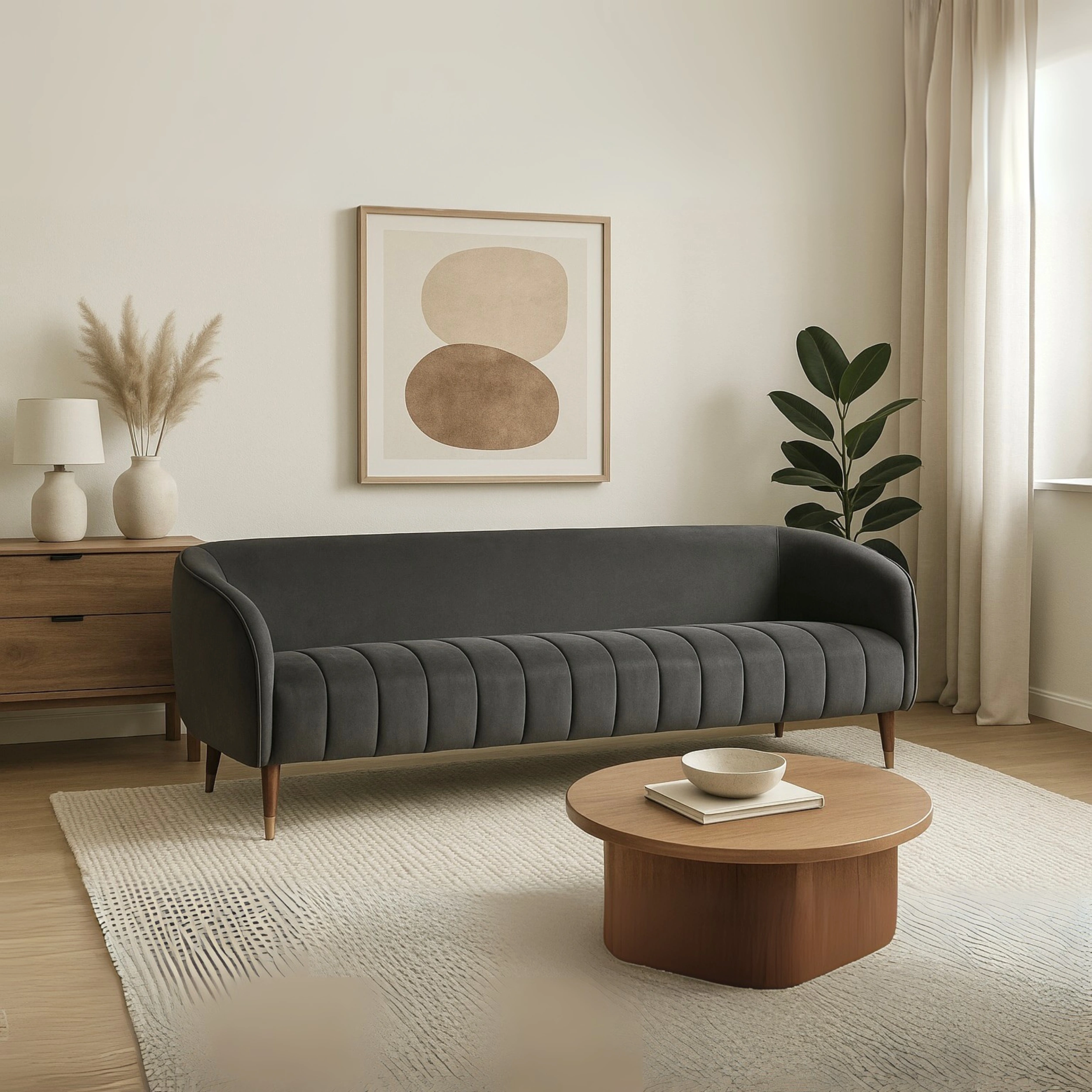 A striking blend of modern elegance and retro glamour, this charcoal velvet 3-seater sofa is designed to make a bold statement. Its full-length channel tufting adds texture and sophistication, while the curved arms and back offer a soft, sculptural form. The clean silhouette rests on sleek tapered legs with brass accents, exuding Art Deco charm.
