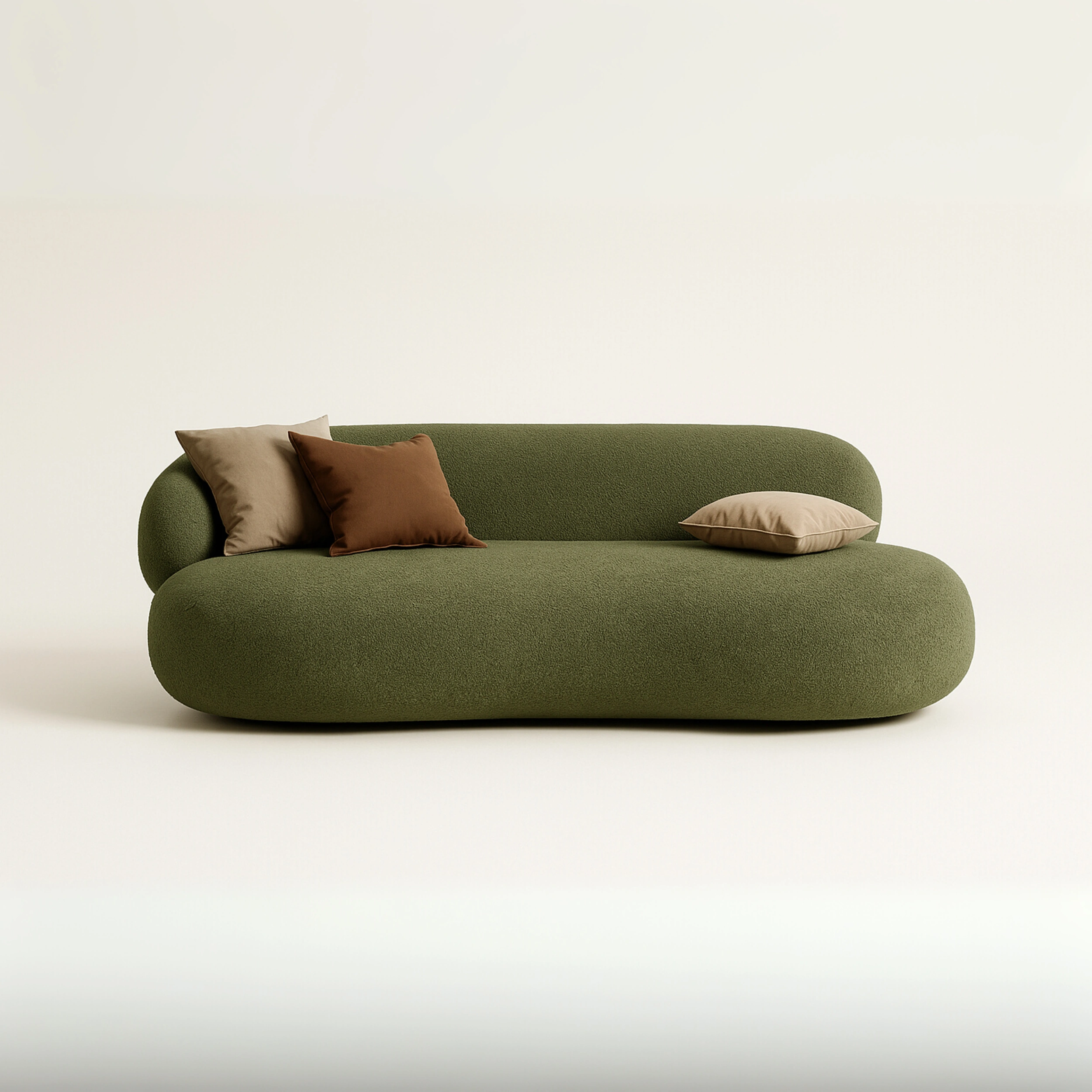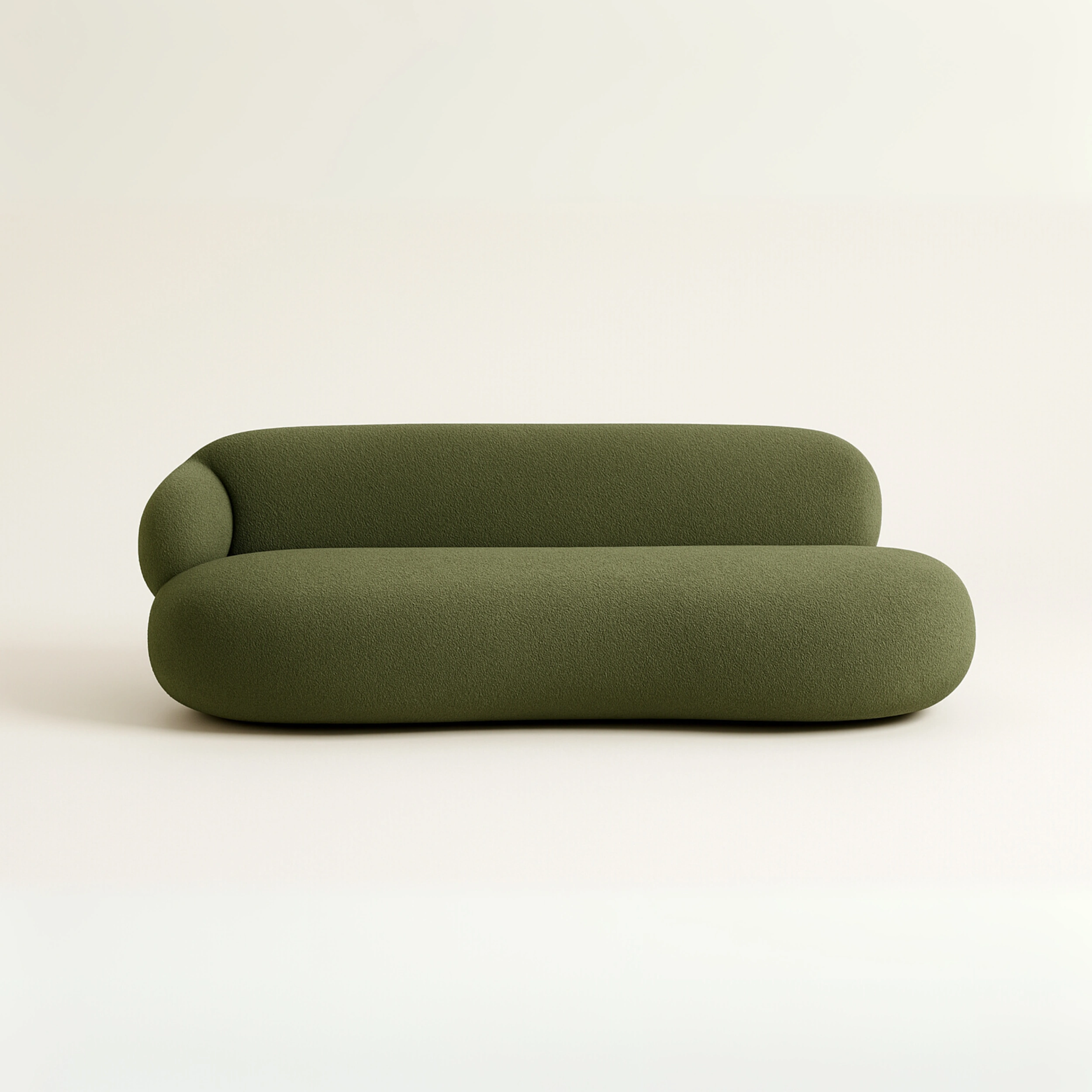 This sculptural, fully-upholstered sofa in forest green bouclé blends modern art and everyday comfort. Featuring an exaggerated, organic silhouette with rounded edges, it creates a bold statement while remaining soft and inviting. The seamless backrest and seat profile offer a cocoon-like seating experience—ideal for lounge-style settings, reading nooks, or upscale modern living rooms.