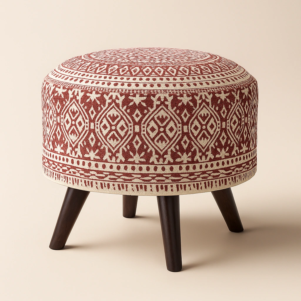 This decorative pouf features a charming cylindrical shape adorned with intricate ethnic motifs in earthy tones. Crafted with artisanal detailing, the pouf brings a rustic yet refined aesthetic to any space. It functions well as a casual seat, footrest, or accent piece in living rooms, bedrooms, or lounges. The sturdy wooden legs add stability while enhancing the handcrafted appeal.