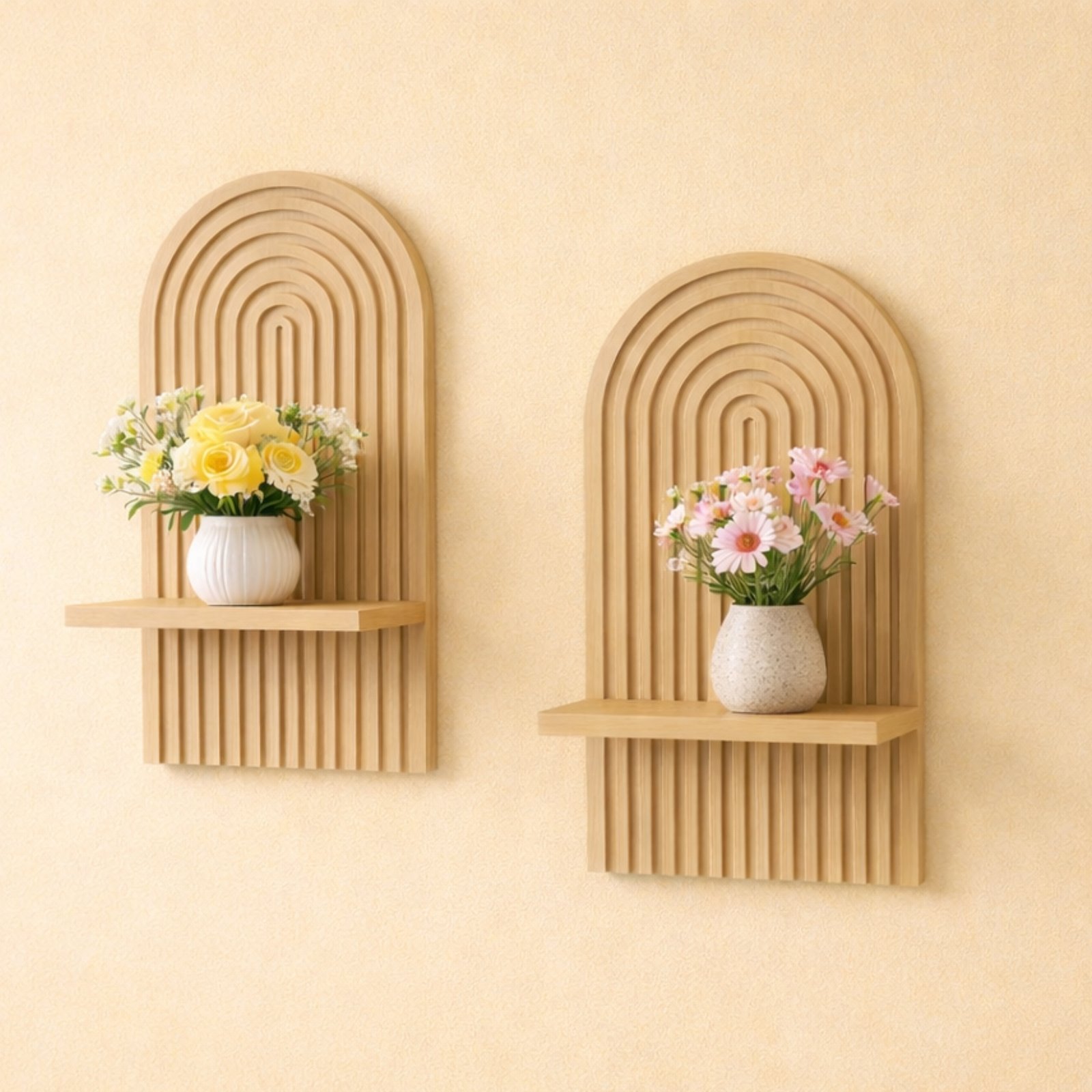 The Zara Wall Shelf is a beautifully crafted wall-mounted décor shelf that blends soft architectural curves with modern minimalism. Featuring an elegant arched back panel with vertical fluted detailing, this shelf adds depth, texture, and warmth to any wall. The compact display ledge is perfect for showcasing vases, dried florals, small planters, or art objects, making it both functional and decorative.